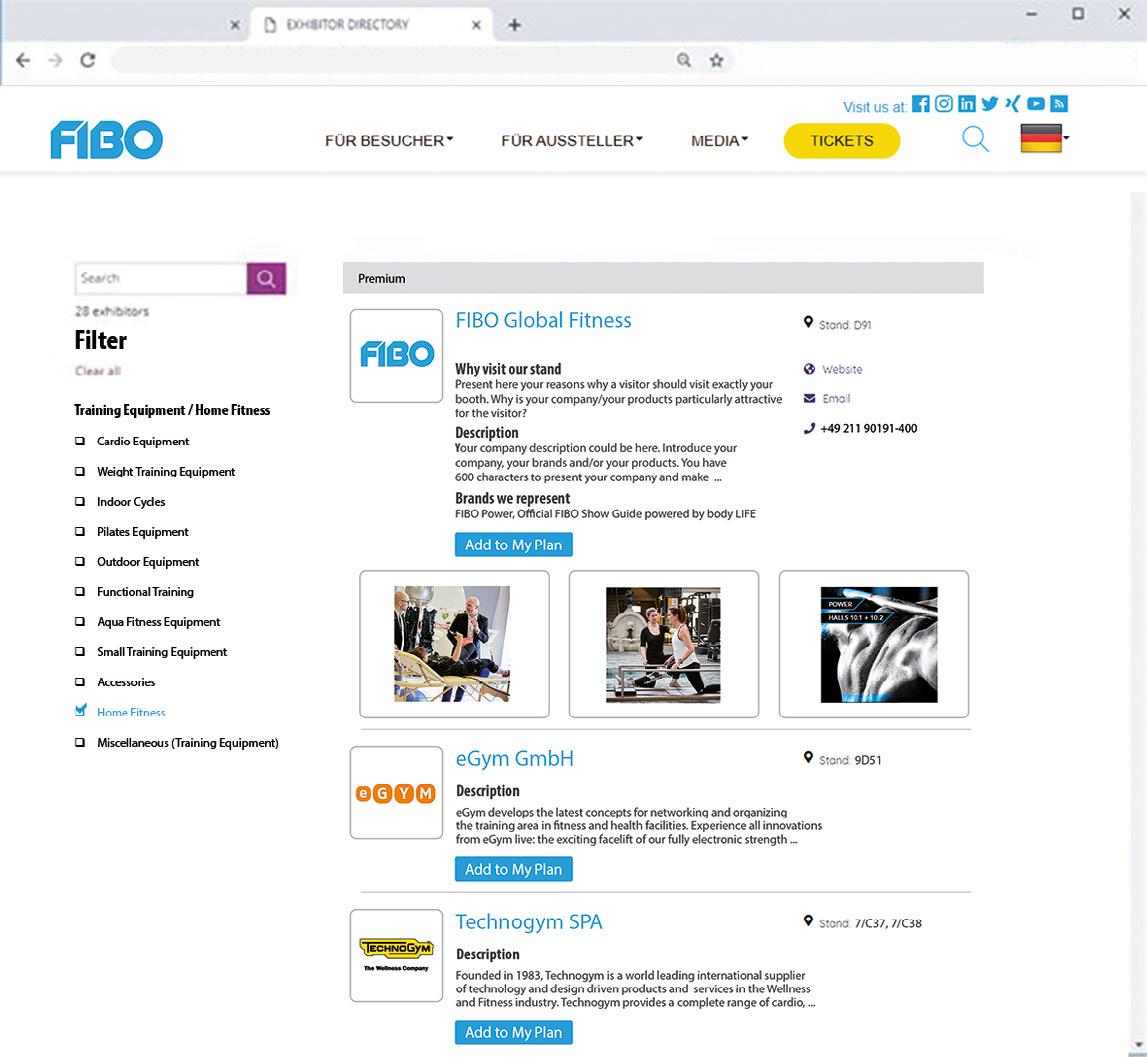 Wenn Besucher ihren Messebesuch vorbereiten, nutzen sie dafür die Ausstellerliste. Das heißt für Sie als Aussteller: Hier sollten Sie gesehen werden! Das Exhibitor Profile Paket sorgt genau dafür: Die wichtigen Entscheider und Einkäufer entdecken bei der Recherche Ihr Logo, Ihre Innovationen, Ihre Kontaktdaten und Ihre Standnummer – sowohl online als auch offline.