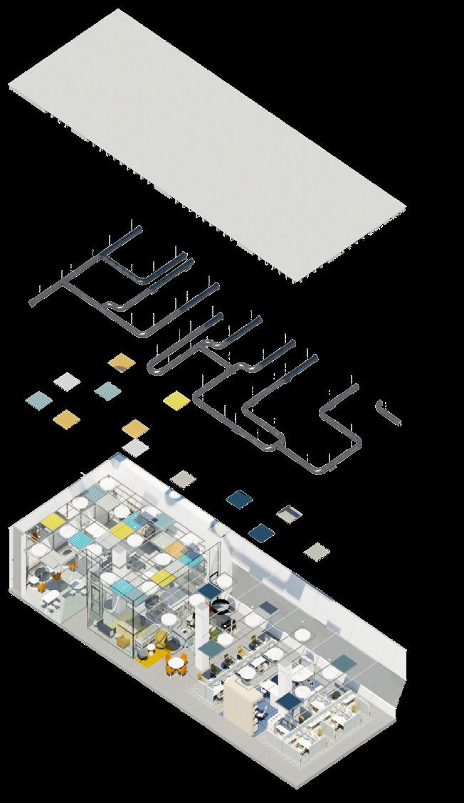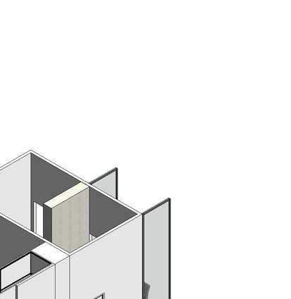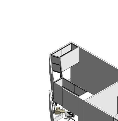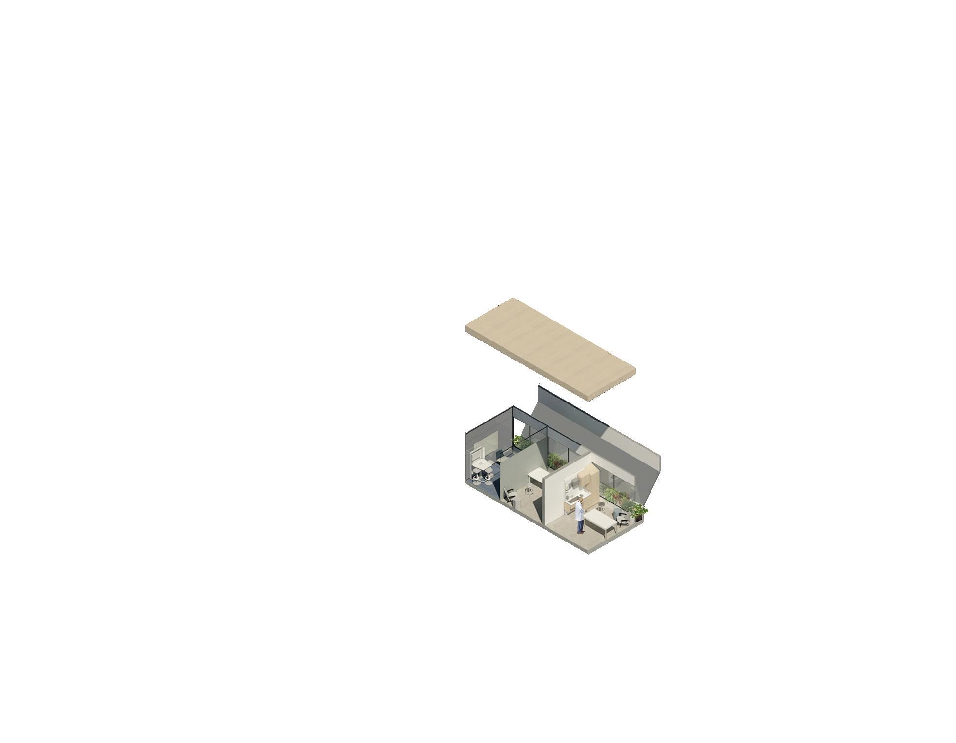 unusual geometry, an opportunity arose. If this dead end corridor could be used for just circulation, it would also mean the doors would face the window and require more closure of spaces. But instead, if this space was used as a linear strip of indoor plants, that do not require much square-footage, this meant access to the windows was being taken advantage of fully. With this being said, because the linear strip is not accessible via a common pathway, almost full height operable windows are installed in the rooms adjacent to the exterior windows. This allows the user of the space to control the conditions in regards to accessing the plants or wanting more acoustic privacy.