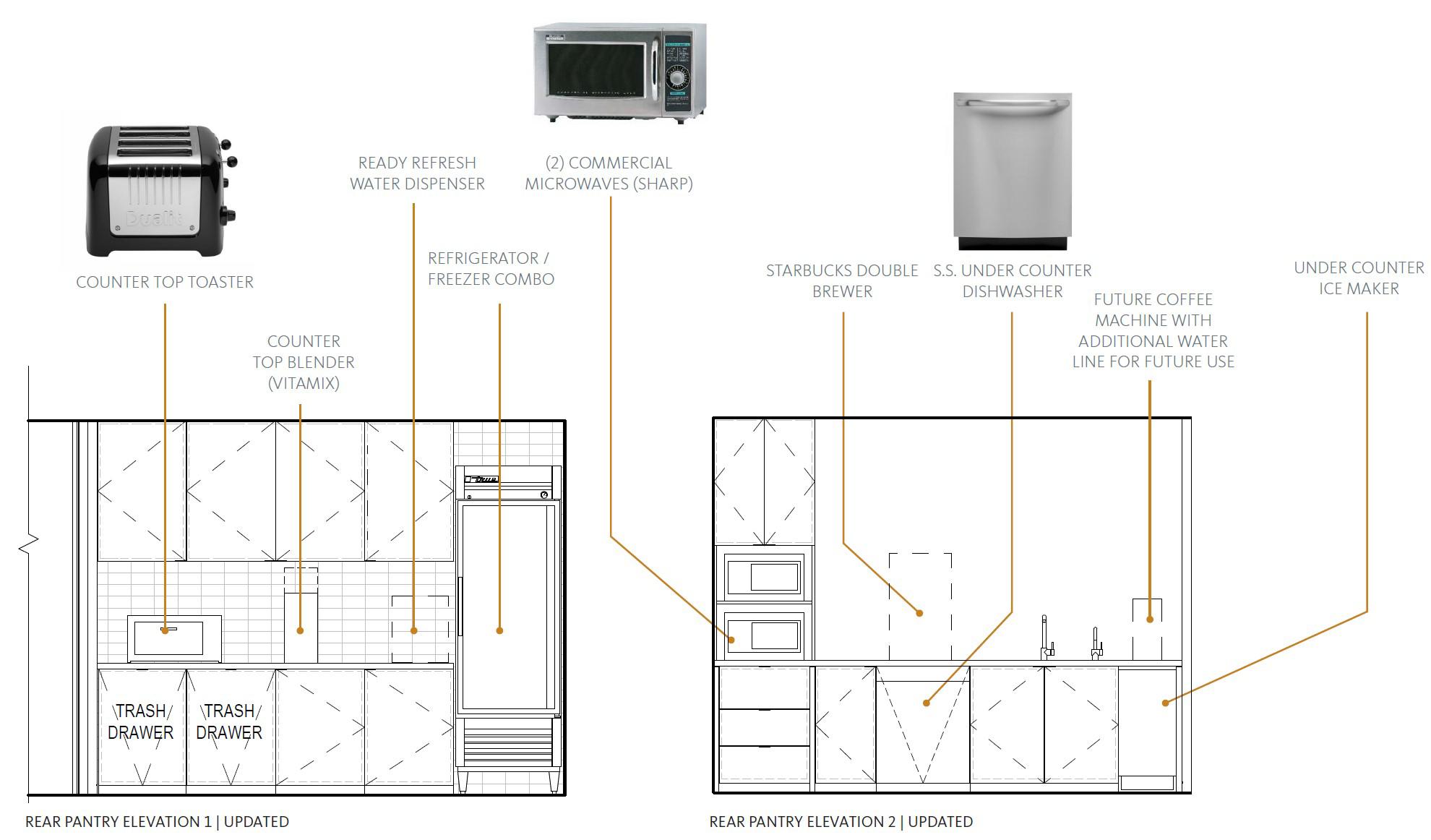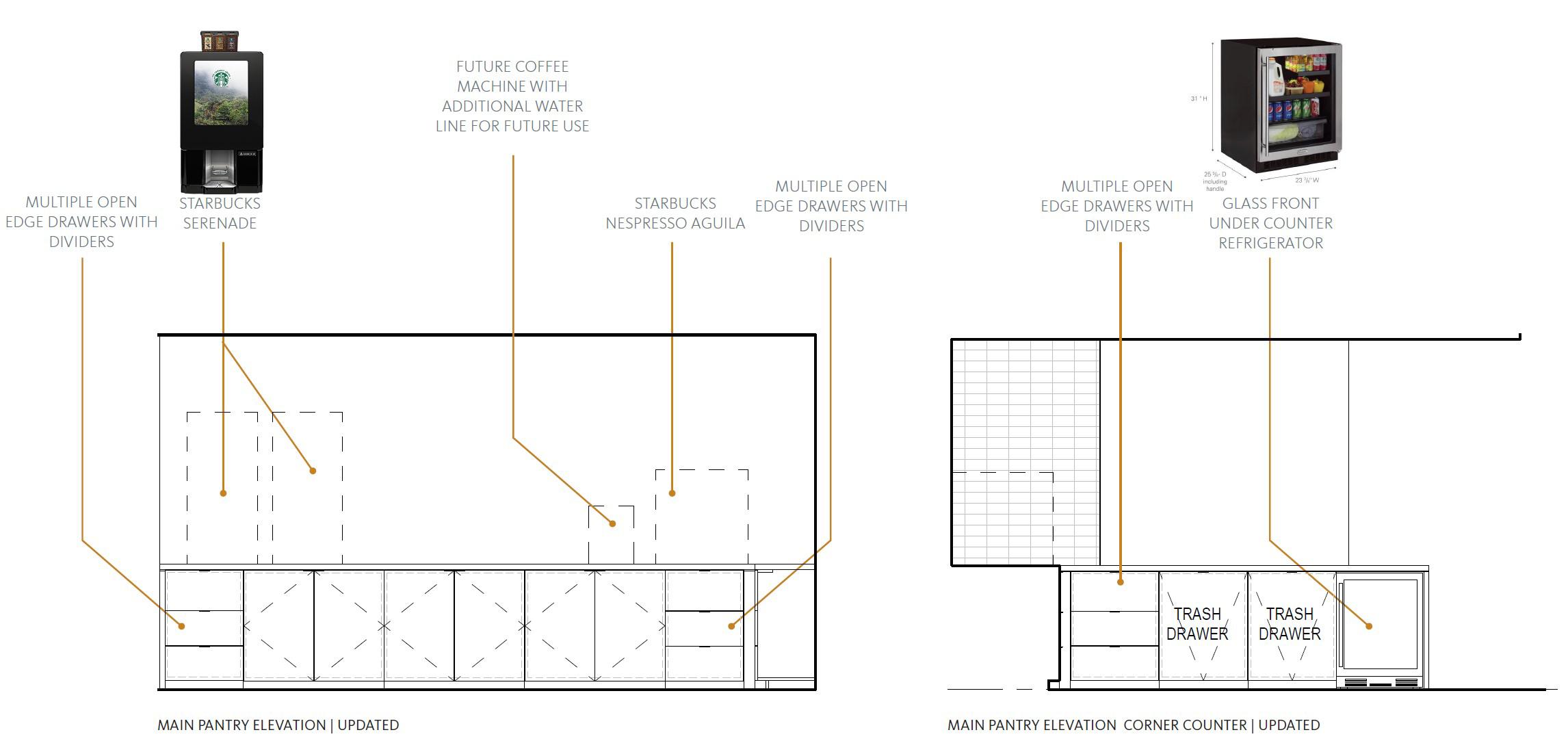 Top cabinets are attached to an automated track system that allows the user to lower the shelves when needed. While LED strip lights are provided under the cabinets to provide task lighting.