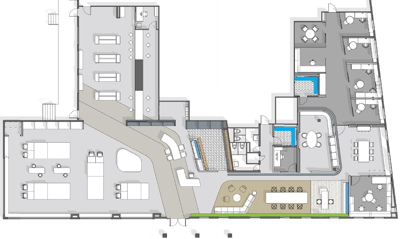 The integration of the linear garden strip purifies the air and provides views to green spaces which boost focus and productivity.