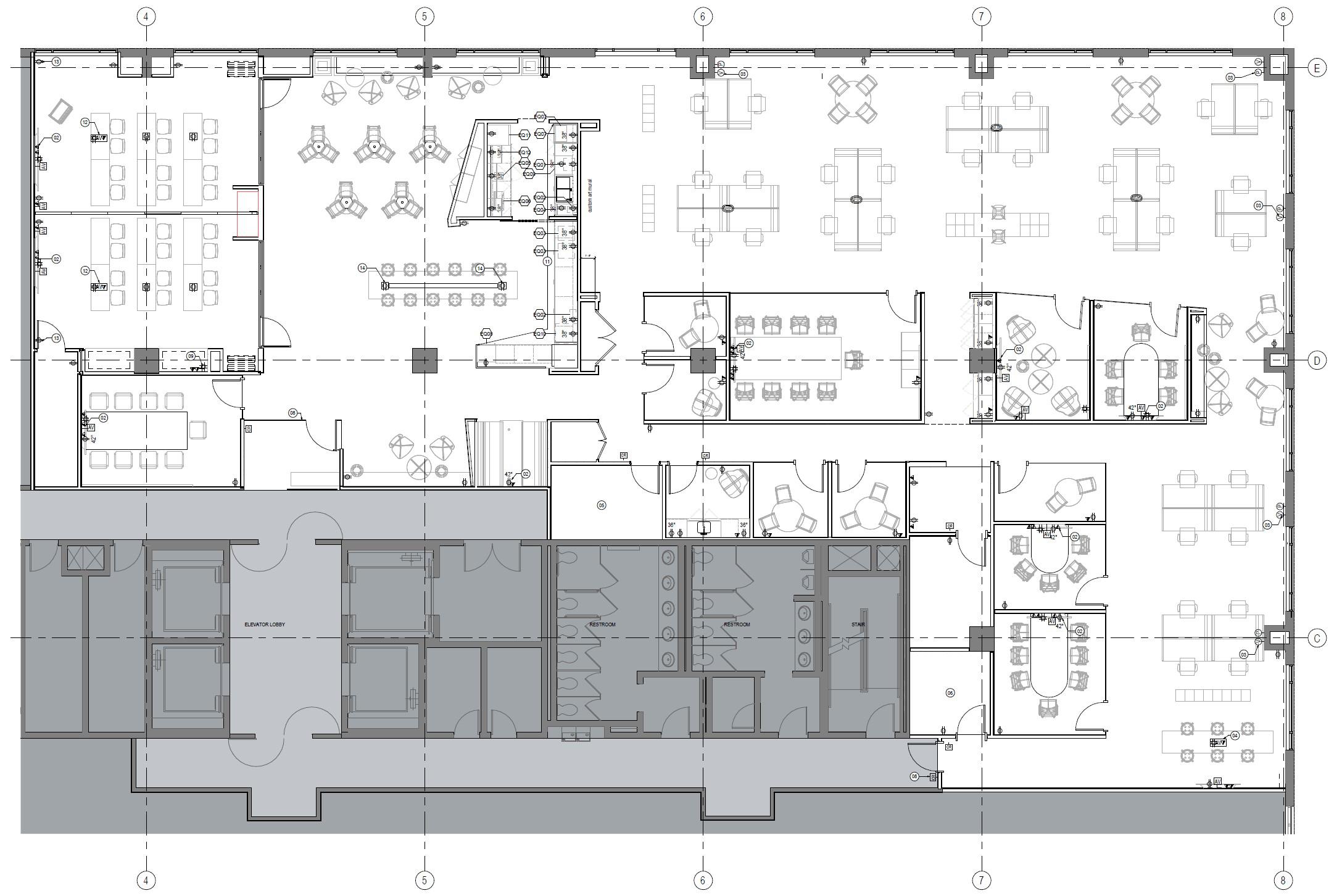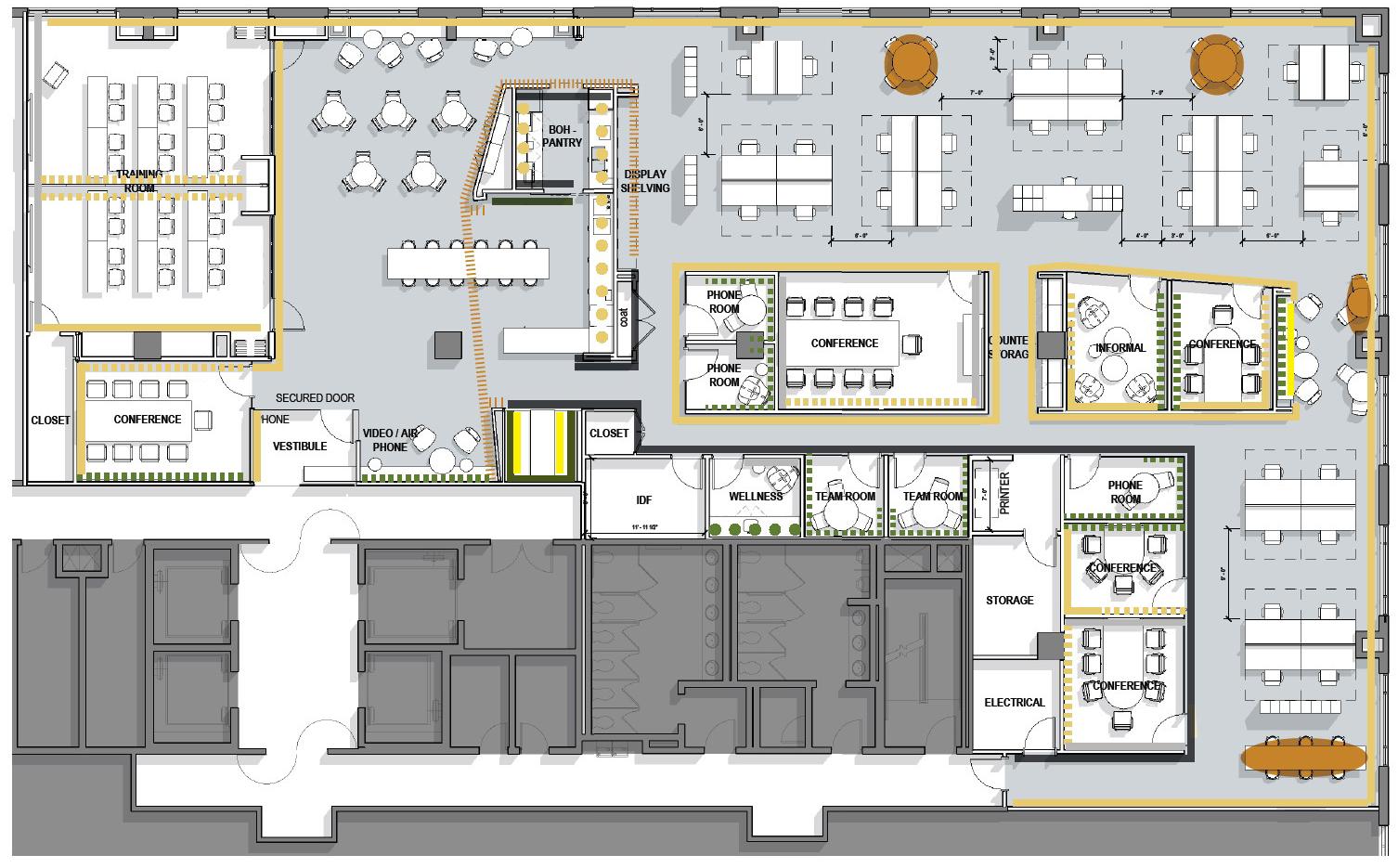 Inspired by Seattle’s urban layout in using the grid, the NEXT Medical Office uses an underlying grid framework to coordinate spaces within the program in a systematic way easily understood by all users. As a layout, the grid possesses familiarity with users, giving the patients the ease of being able to coordinate within an unknown space. By laying out spaces along a framed grid, users can easily navigate upon entering the medical office. The grid not only serves in way finding, but also allows spaces to be interchangeable due to their familiar sizes and shapes. It also serves to represent the NEXT Medical Office’s brand, showing the office’s bright and optimistic culture while still maintaining medical professionalism.