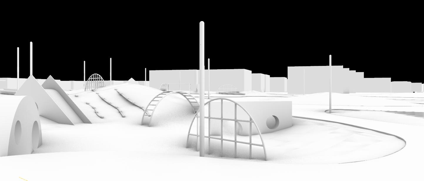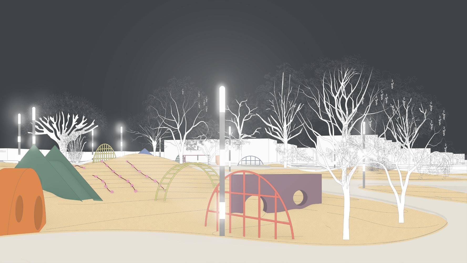 The outdoor garden area connects all sections of the facility to one another by creating a shared focal space. Both wards connect allowing children, visitors, and staff members opportunities to interact while being exposed to natural light and fresh air. The garden acts as a self sustaining mechanism as it utilizes Kuwait’s natural landscape by specifying native plant species, covering the building’s roof with solar panels, using a gray watering system, and providing an overhead canopy to partially shield users from direct sunlight.