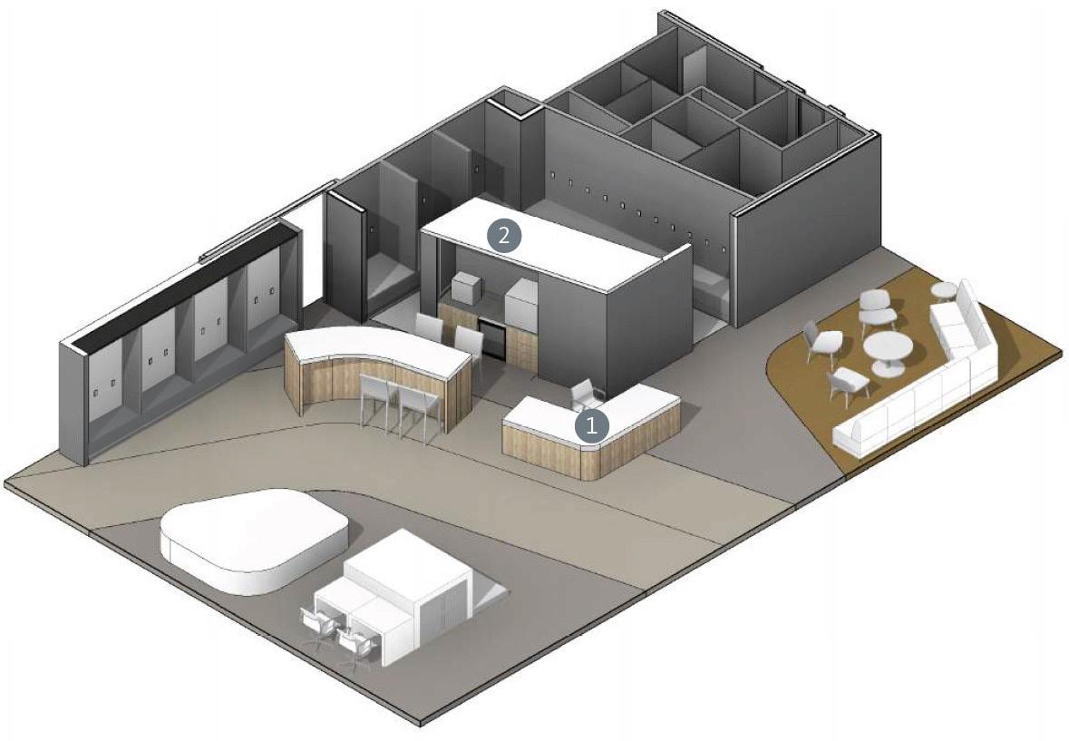 1. Exam Rooms 2. Break Out / Collaboration Spaces 3. Acupuncture Room 4. Massage Rooms 5. ADA Unisex Washrooms 6. Water Fountains 7. Nursing Mother / Relaxation Room 8. Medium Conference Room 9. Large Conference Room 10. Laundry Environmental Space 11. Work Cafe 12. Lounge / Breakout Spaces 13. Medical Supply Room 14. Resource Center 15. Open Office FLOOR PLAN LEVEL 1 + MEZZANINE: N 1. 1. 1. 1. 1. 1. 1. 1. 1. 1. 2. 3. 4. 4. 5. 5. 2. 7. 6. 2. 8. 9. 25. 24. 28. 27. 29. 30. 26. 22. 22. 20. 20. 21. 19. 18. 17. 10. 11. 12. 13. 14. 15. 16. 16. 16. 19. 18. 18. 17. 12. 5. 15. 16. Education and Lifestyle Zone 17. Collaboration Spaces 18. Shared Office 19. Exercise / Gym Room 20. Phone / Quiet Room 21. Staff Lockers and Waiting Area 22. Consultation Room 23. Reception Waiting Area 24. Reception Area 25. Reception Desk 26. Records and Transaction Space 27. Self Check-in 28. Main Entrance 29. Staff Entrance 30. Indoor Garden Strip 13