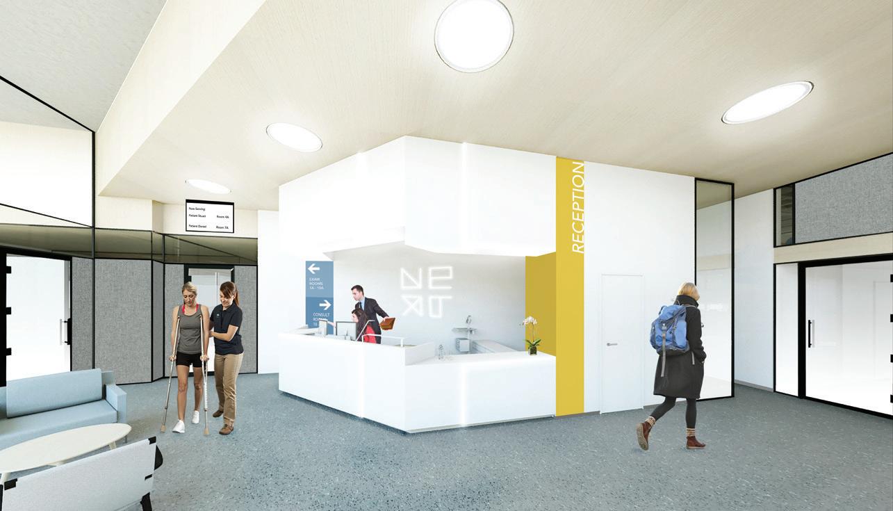 The grid is incorporated within the brand logo, while also being a reinterpretation of the Red Cross, which is associated by many with healthcare. The cross is then used in the design of the reception desk.