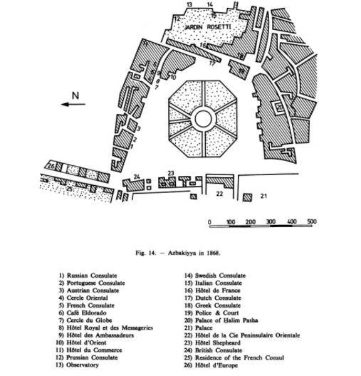Figure 5. Map of Azbakiyya district in the 18th century. (BehrensAbouseif, Doris. Azbakiyya and Its Environs : From Azbak to Ismā’īl, 1476-1879. Supplément Aux Annales Islamologiques ; Cahier No 6. Le Caire: Institut Français D’archéologie Orientale, 1985.)