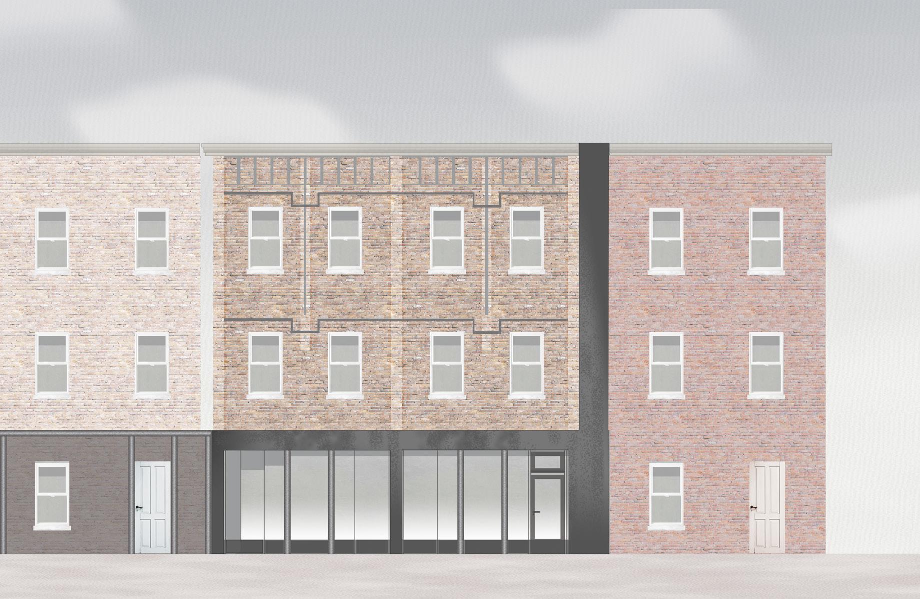 Art Made Gallery is a three storey building that encompasses a two storey exhibition space along with an apartment on the third floor. Located in downtown Ithaca, NY, the tenants are seeking to exhibit Ghadah Al Kandari’s work, a Kuwaiti based artist who uses a repeating subject in her works, whom she refers to as “Eve”. The gallery draws from her art by selecting bright contrasting colors and overlapping geometries to distinguish key spaces within the exhibit as well as aid in way finding. Her works are displayed in chronological order upon entering the space, starting by a display of her sketches and water colors, then paintings, and ending with her three