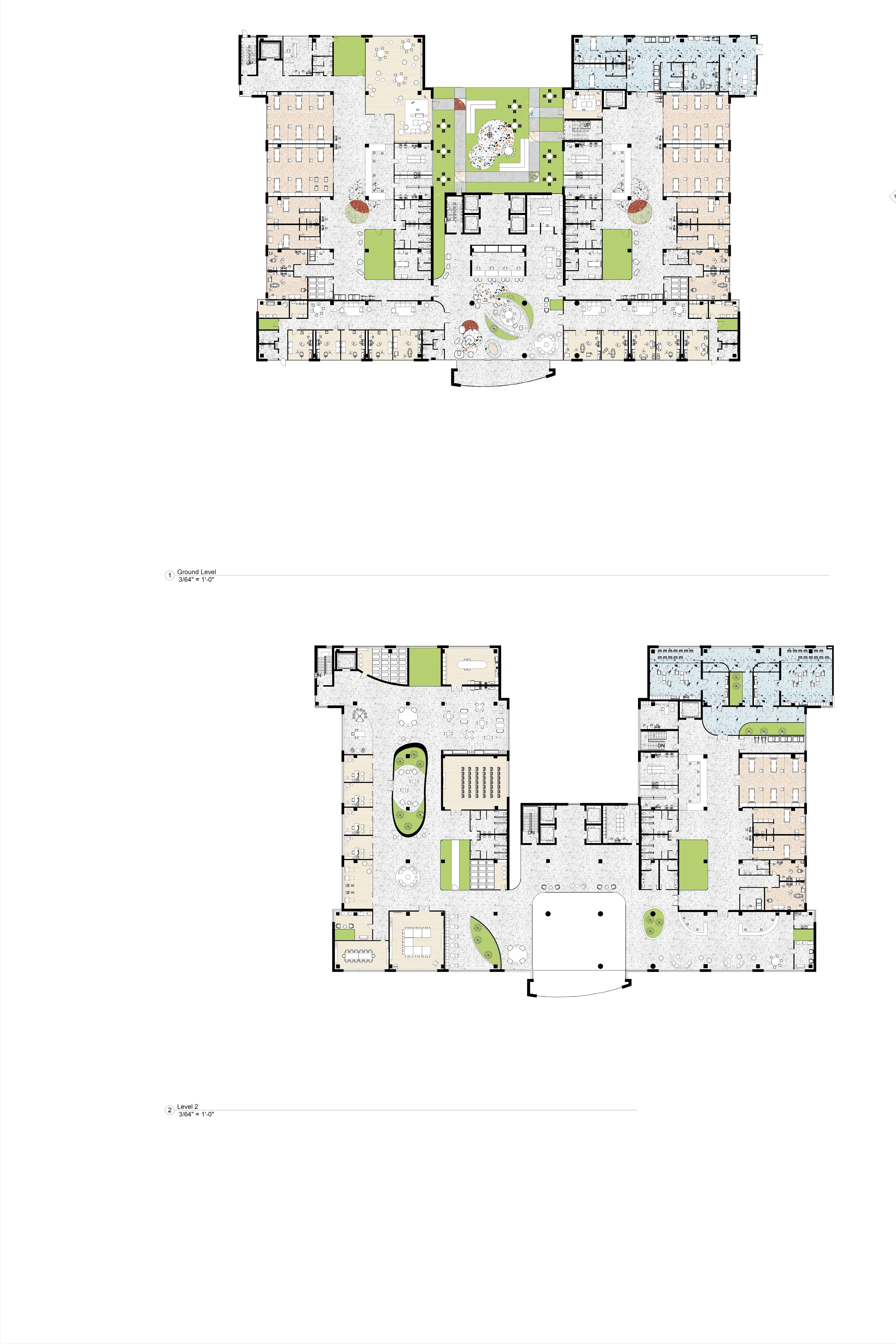 The Center will use these garden spaces as healing gardens, spaces for children to interact and play, as well as become focal points within the facility as the wellness services and activities will be located along it’s perimeter. Overall, the placement, function, and character of these gardens will allow users to easily navigate throughout the facility using the gardens as landmarks to distinguish different sections within the Center.