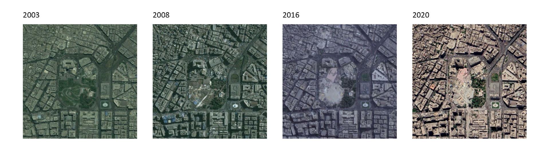Figure 8. Aerial imagery showing the history of continuous reduction of Azbakiyya Gardens square footage in the 21st century, even after Khedive Ismail’s initial reduction of the garden. (Created by Reem Bukhamseen, using Google Earth Pro Imagery)