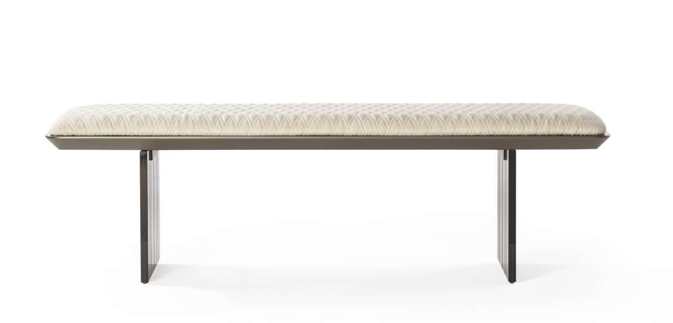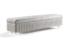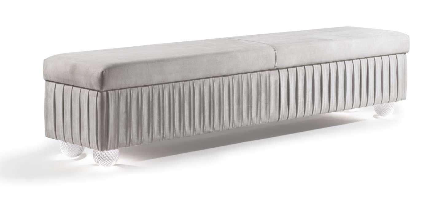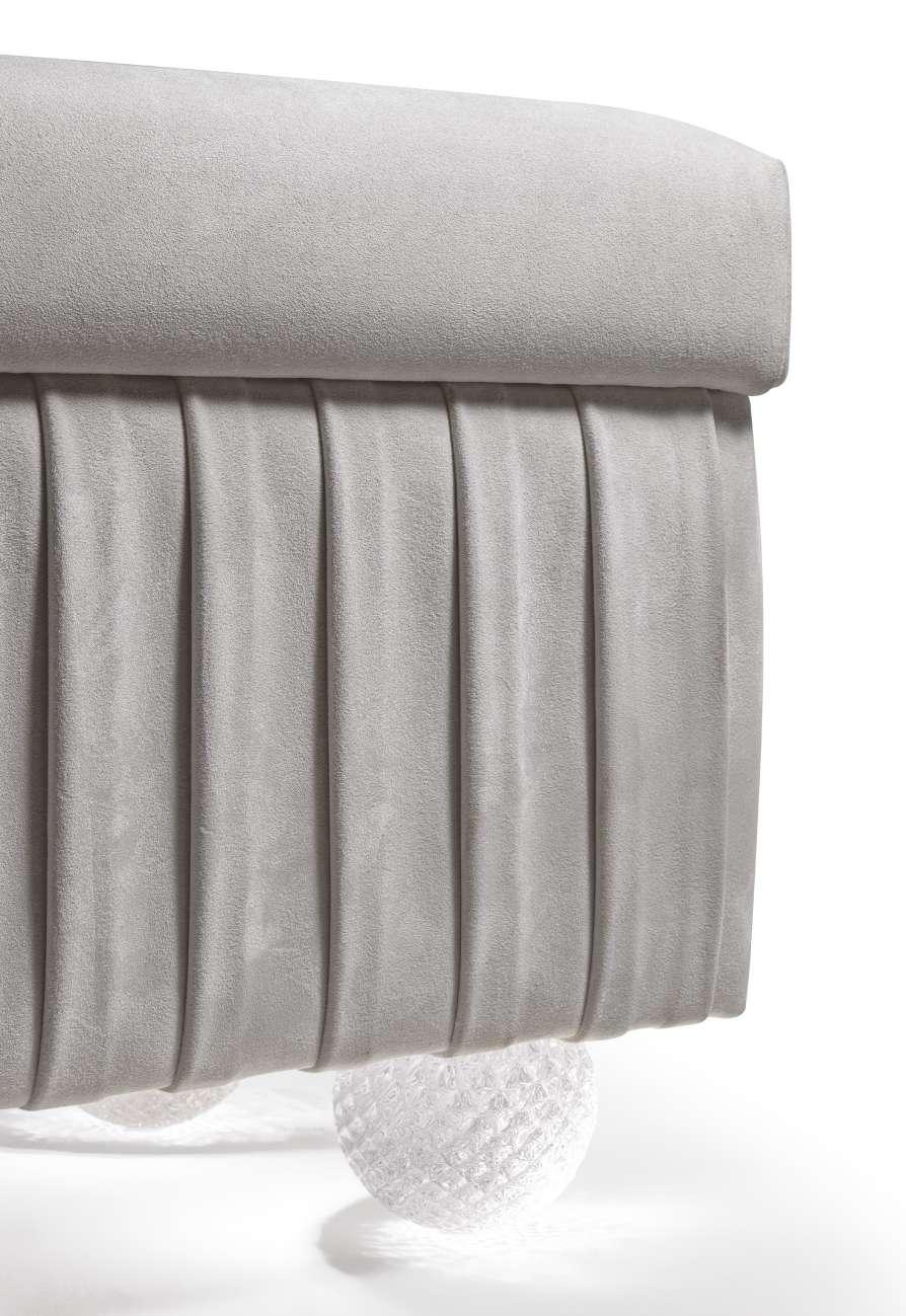 Upholstery leather in Nabuk grigio with plissè finishing and plain top lid Legs in Murano glass with light 212 x 40 x 41 h