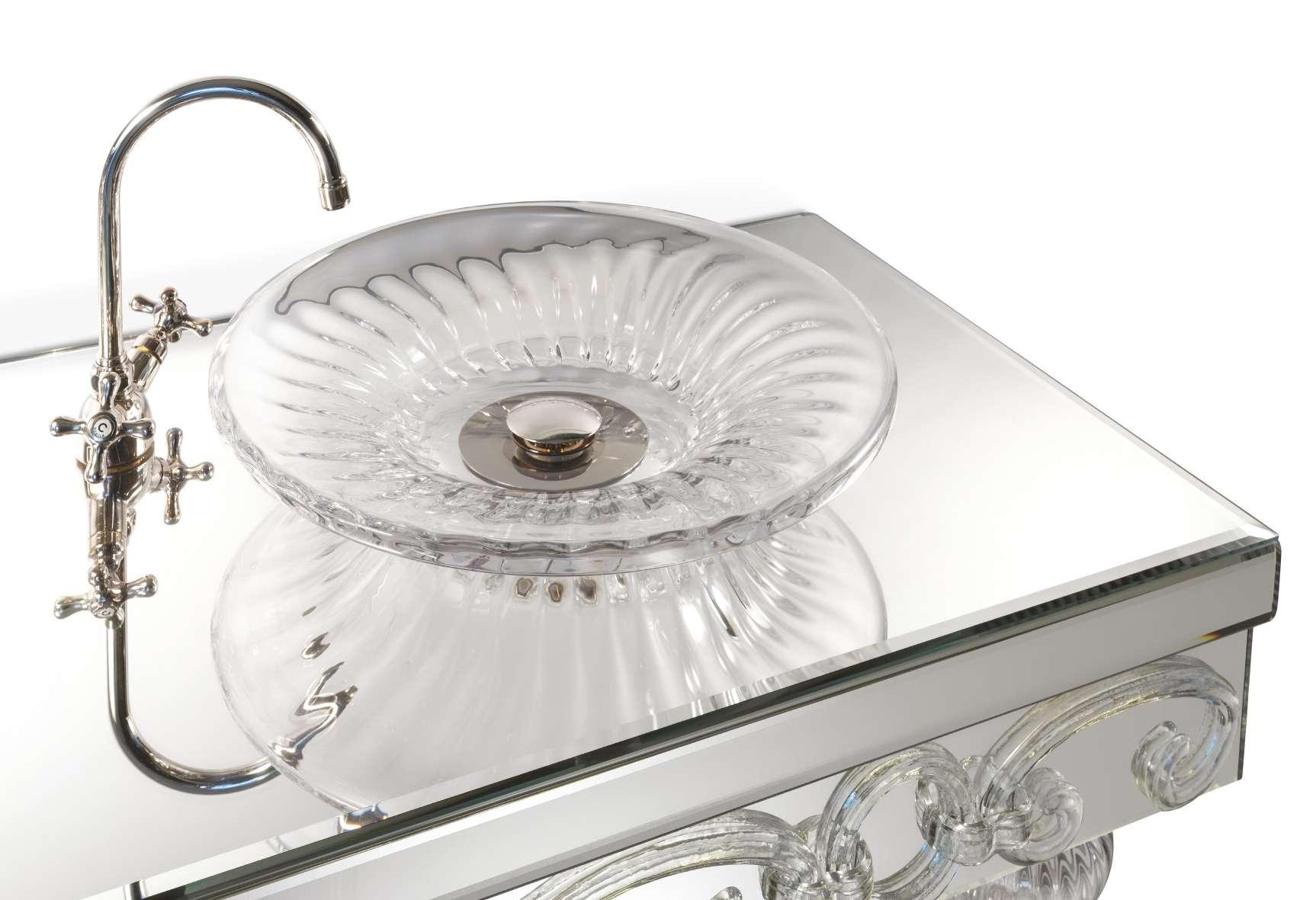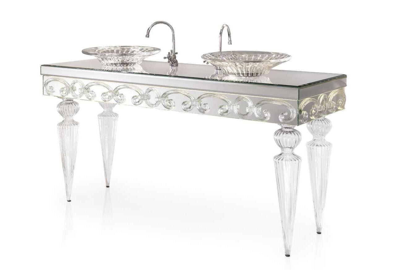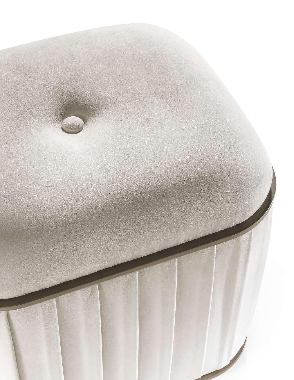 Upholstery leather in Nabuk grigio with plissè finishing and plain top lid Legs in Murano glass with light 212 x 40 x 41 h