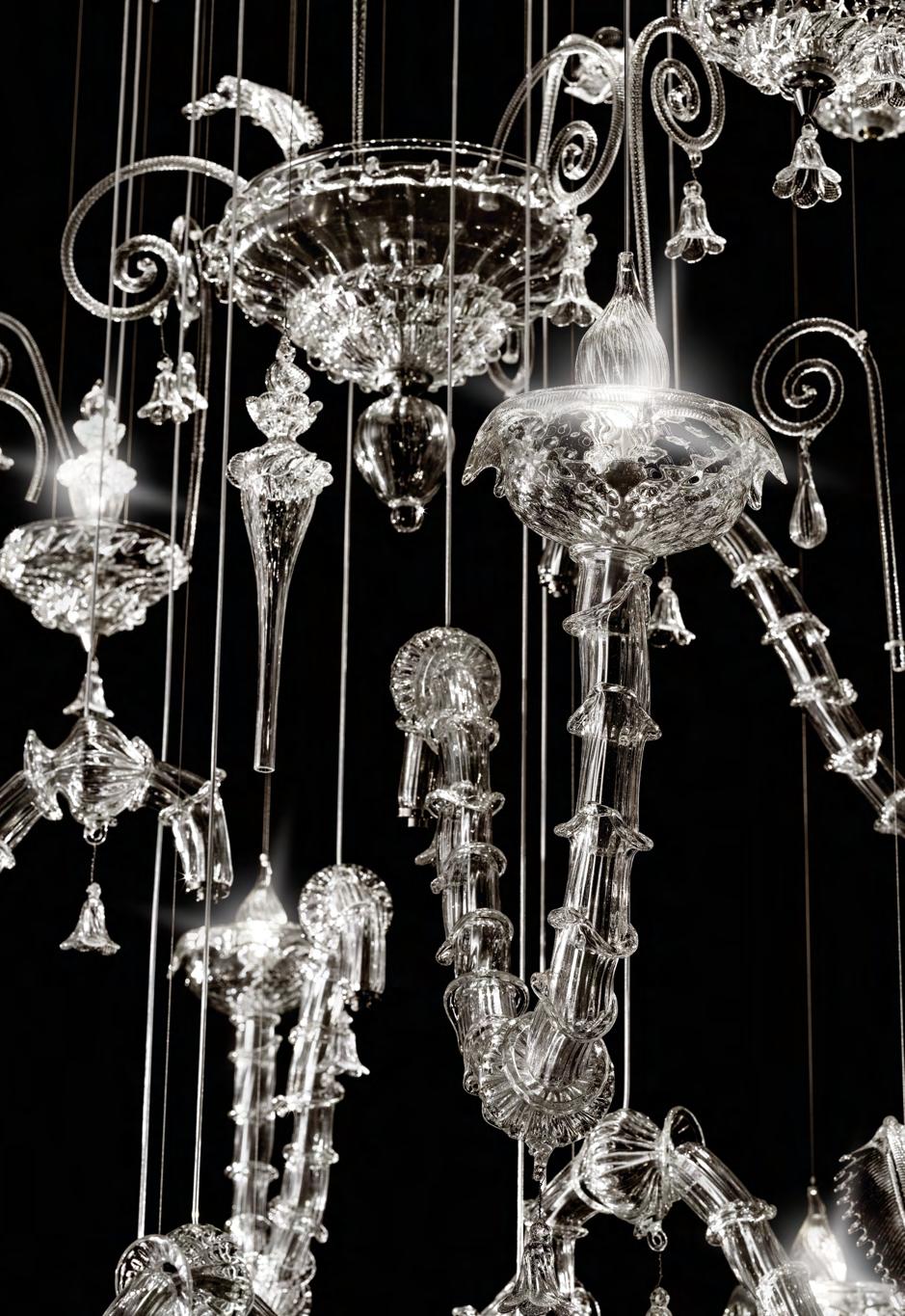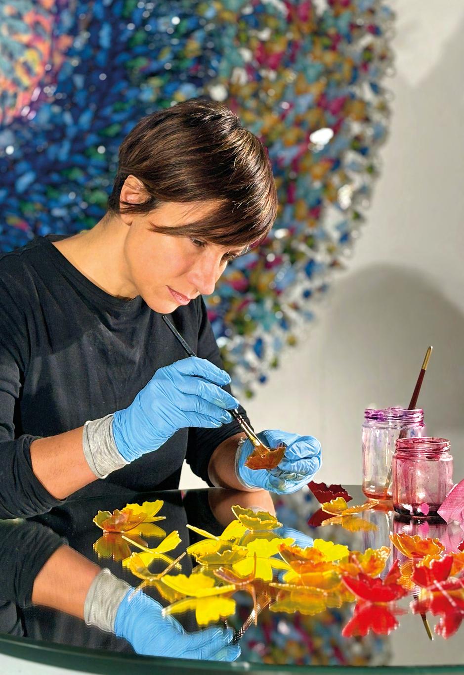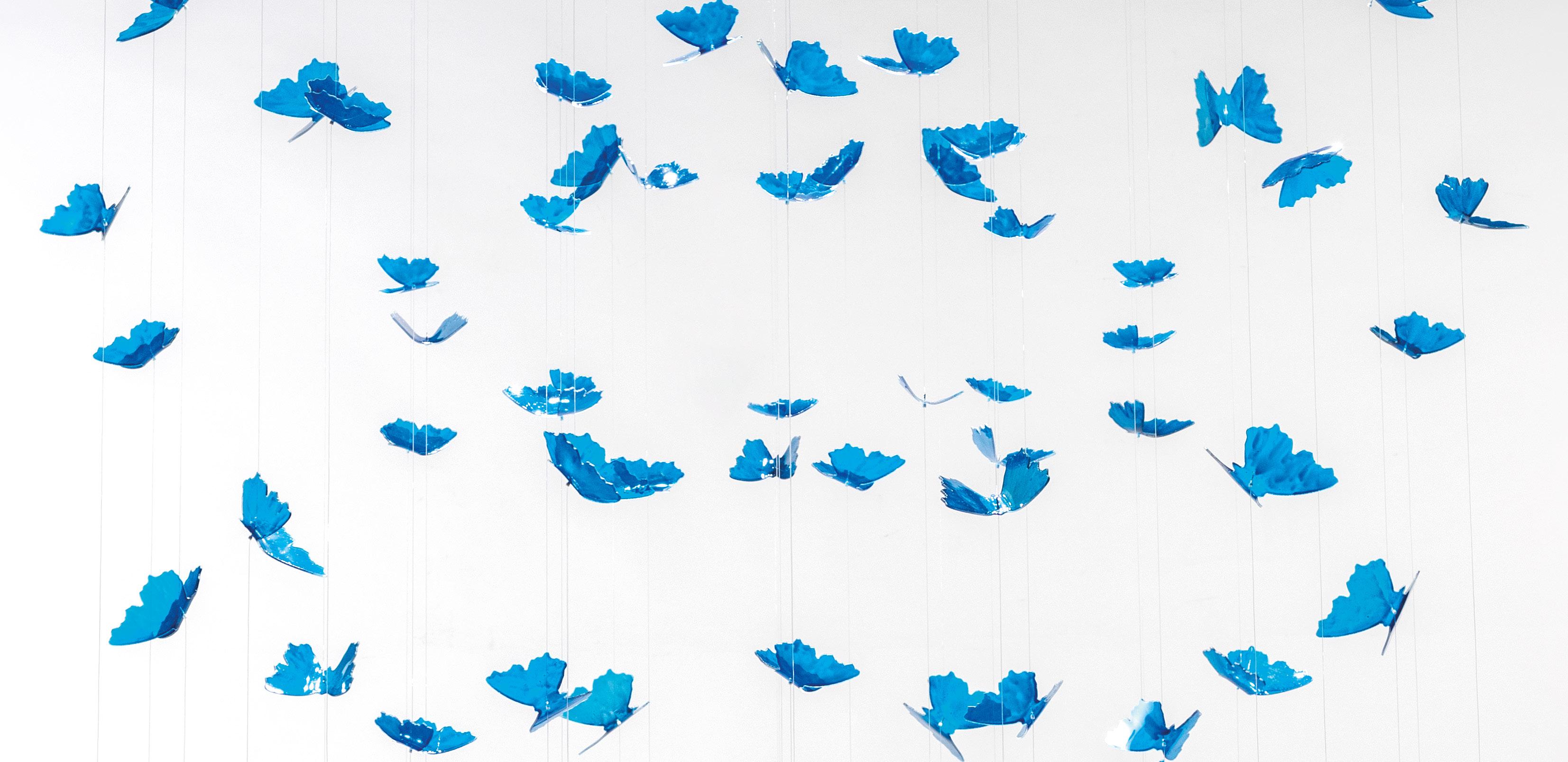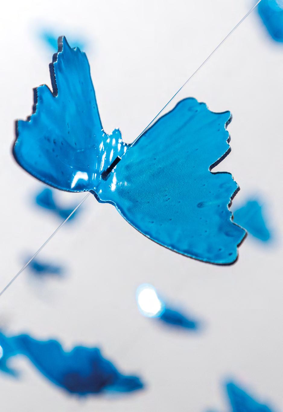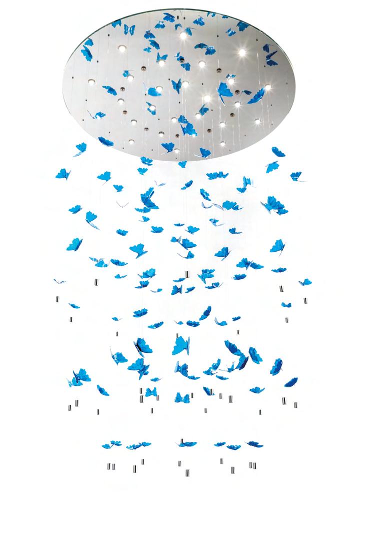 Dreamcatcher Morpho is a "broken-down dreamcatcher" by Annalù who develops a falling composition of hundreds of butterflies in hand-painted glass, each of different sizes. This work creates a strong dynamism thanks to both the oscillating movement of butterflies, both in the light coming from above that spreads the vibrant colors in the surrounding environment, giving a lyrical and poetic intensity.