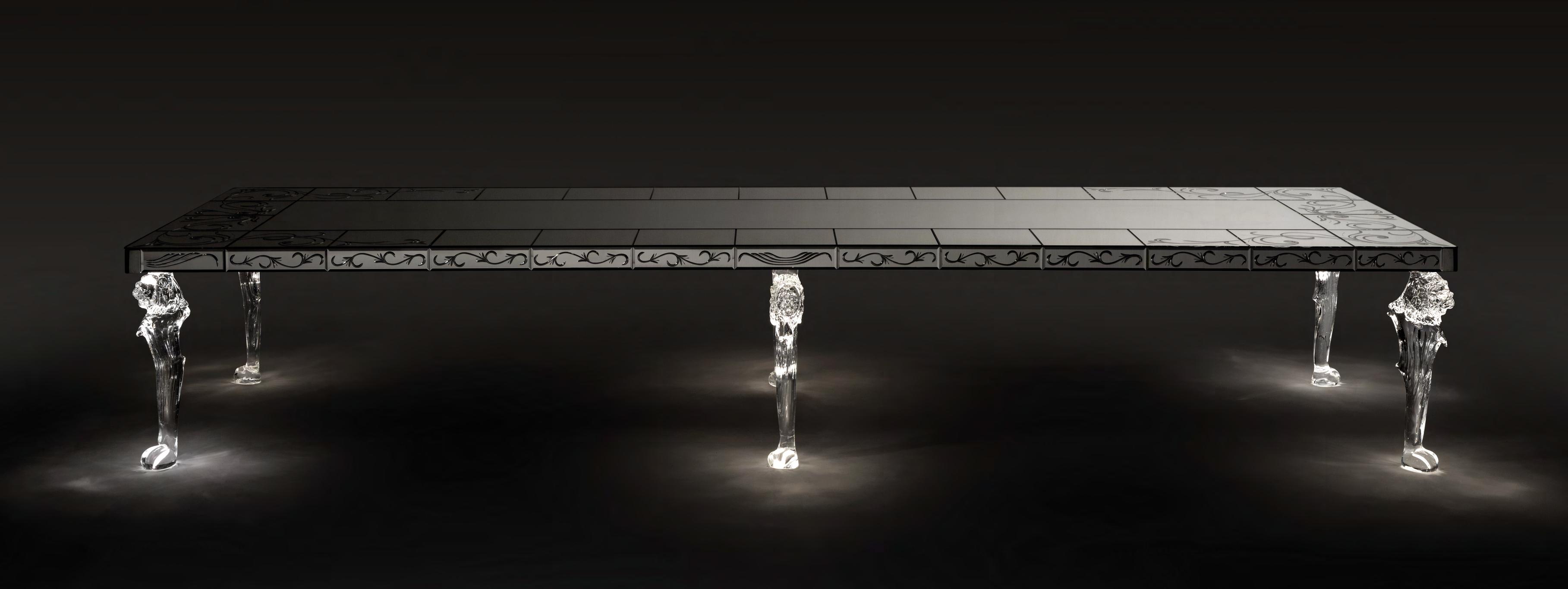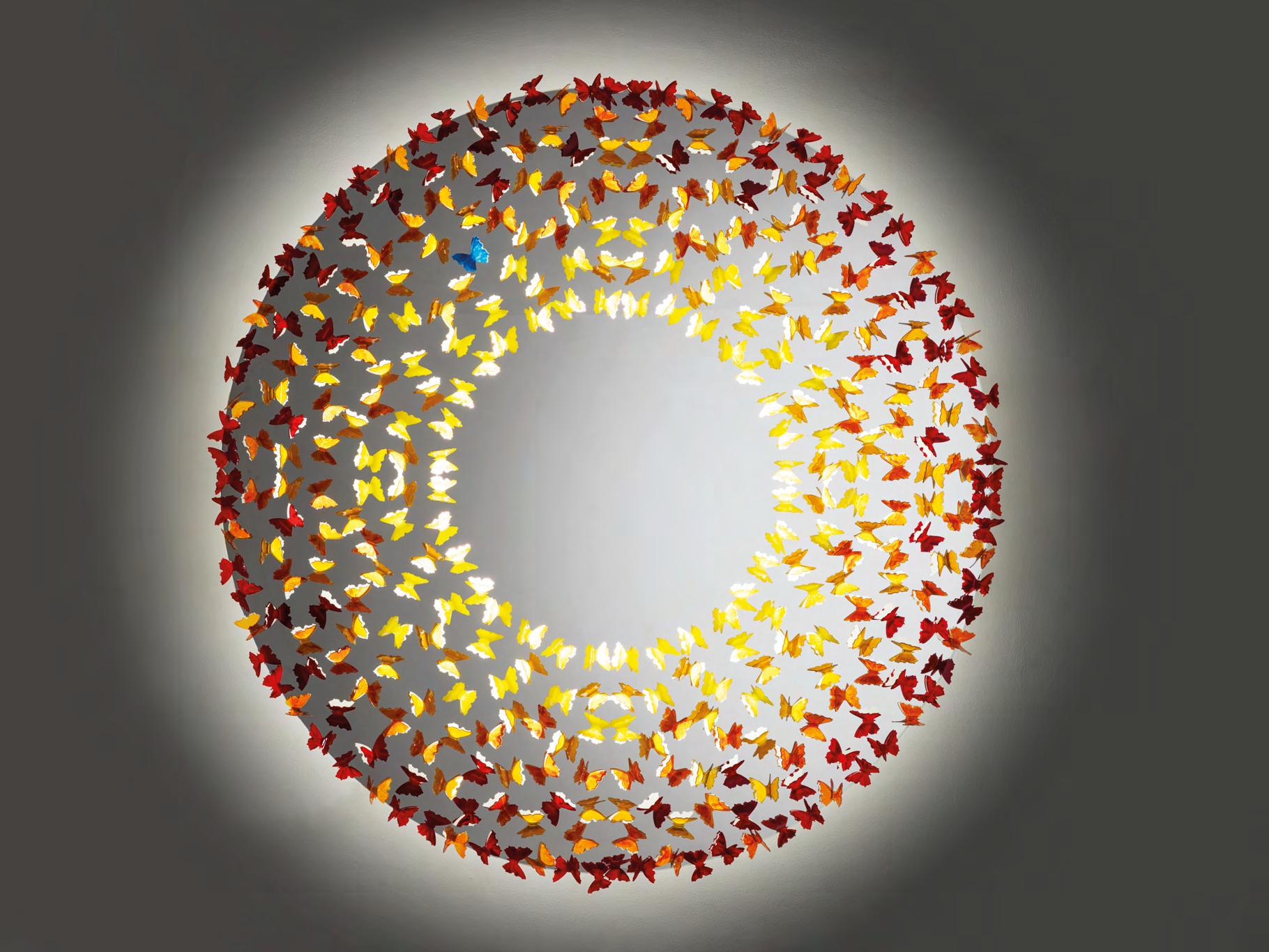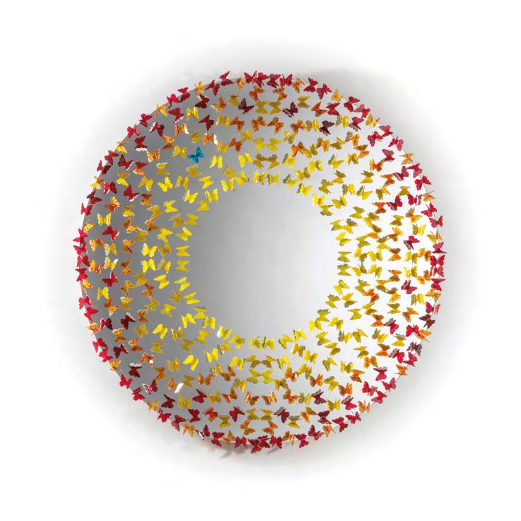 Il design di questo specchio incorpora la struttura distintiva dei famosi dreamcatchers di Annalù, esaltandone sia la geometria rigorosa nel merletto specchiato alla base, sia la vivida cromia nelle centinaia di farfalle in vetro dipinto a mano che ricoprono la superficie.