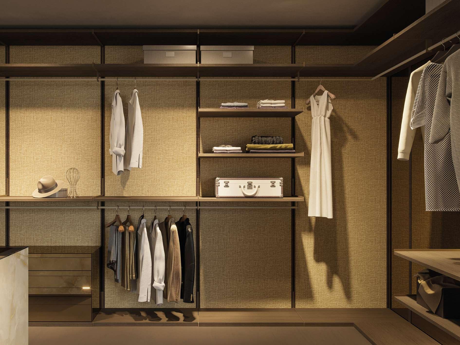 Walk-in closet with drawers and shelves fixed and adjustable. panels in Mayfair 06 Oyster fabric, panels in Bronze Mirror, profiles in Ebony-stained Ash. Canaletto Walnut Hennè shelves, drawers covered in Bronze mirror.