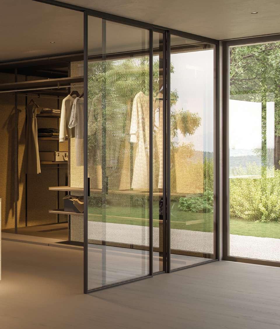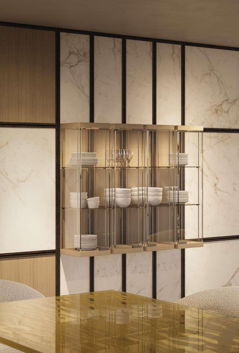 La caratteristica distintiva di Wally è la sua struttura in legno massello: i profili a vista svolgono un ruolo estetico, modulare e funzionale. Le linee verticali e orizzontali dei profili definiscono gli spazi, racchiudendo in una griglia materiali e finiture differenti.
