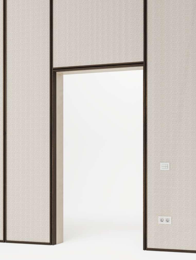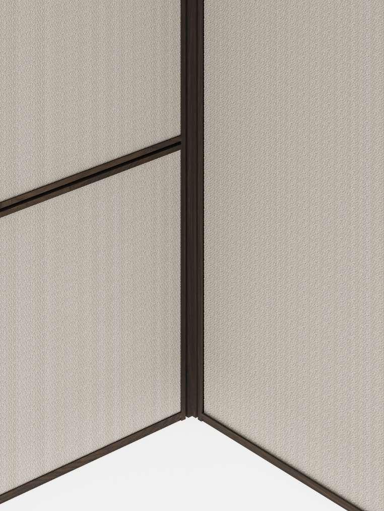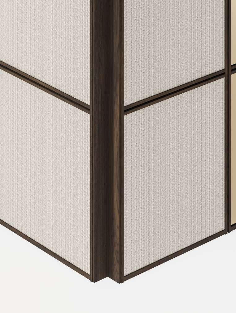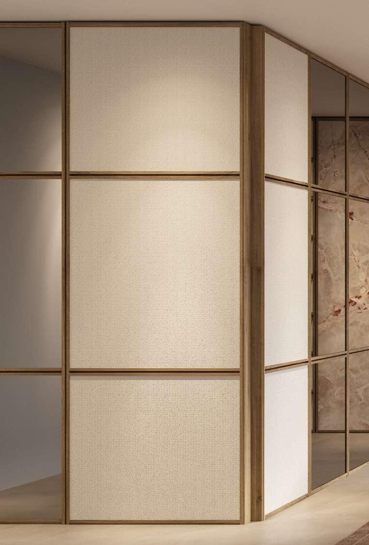 Un sistema di pannelli incorniciati da una struttura in legno, progettato in modo modulare per dar vita a ambienti esclusivi e su misura, che si integra perfettamente con l’architettura delle pareti e dello spazio circostante.