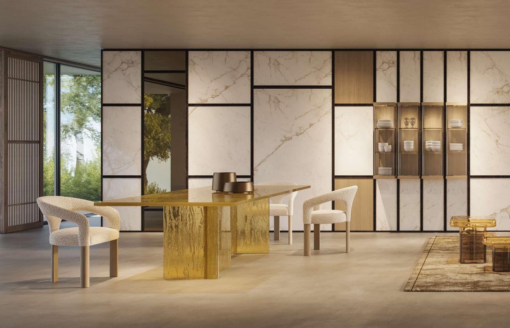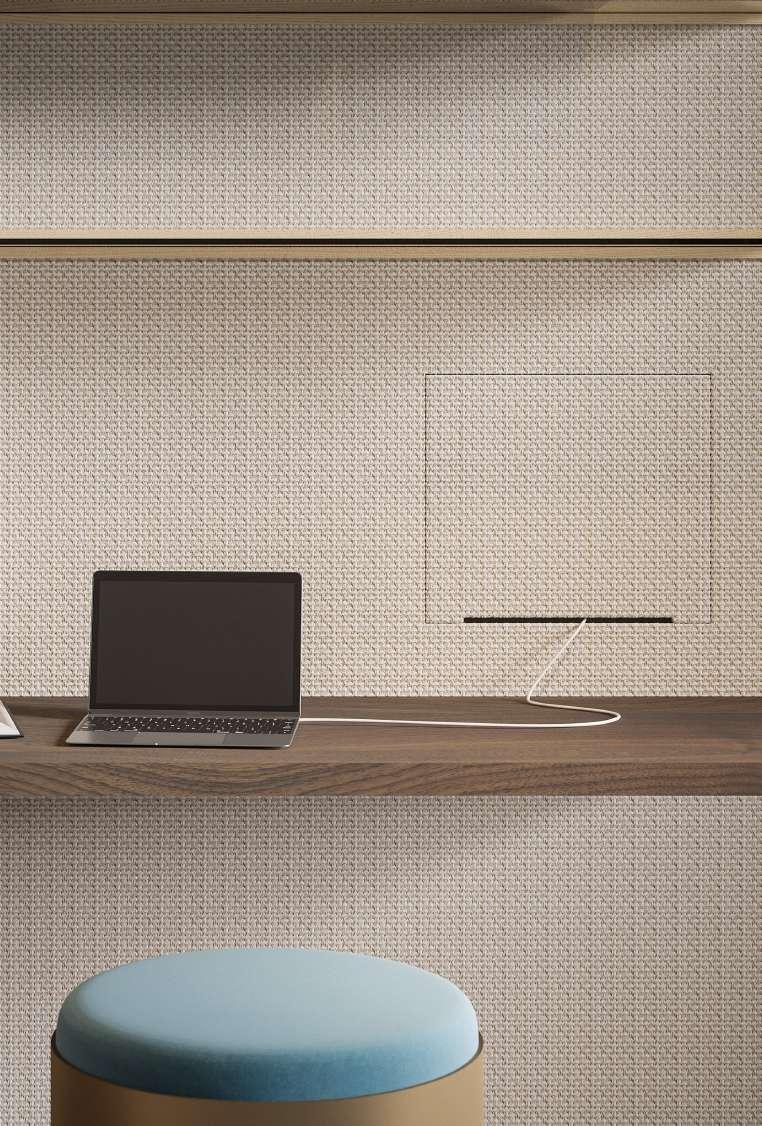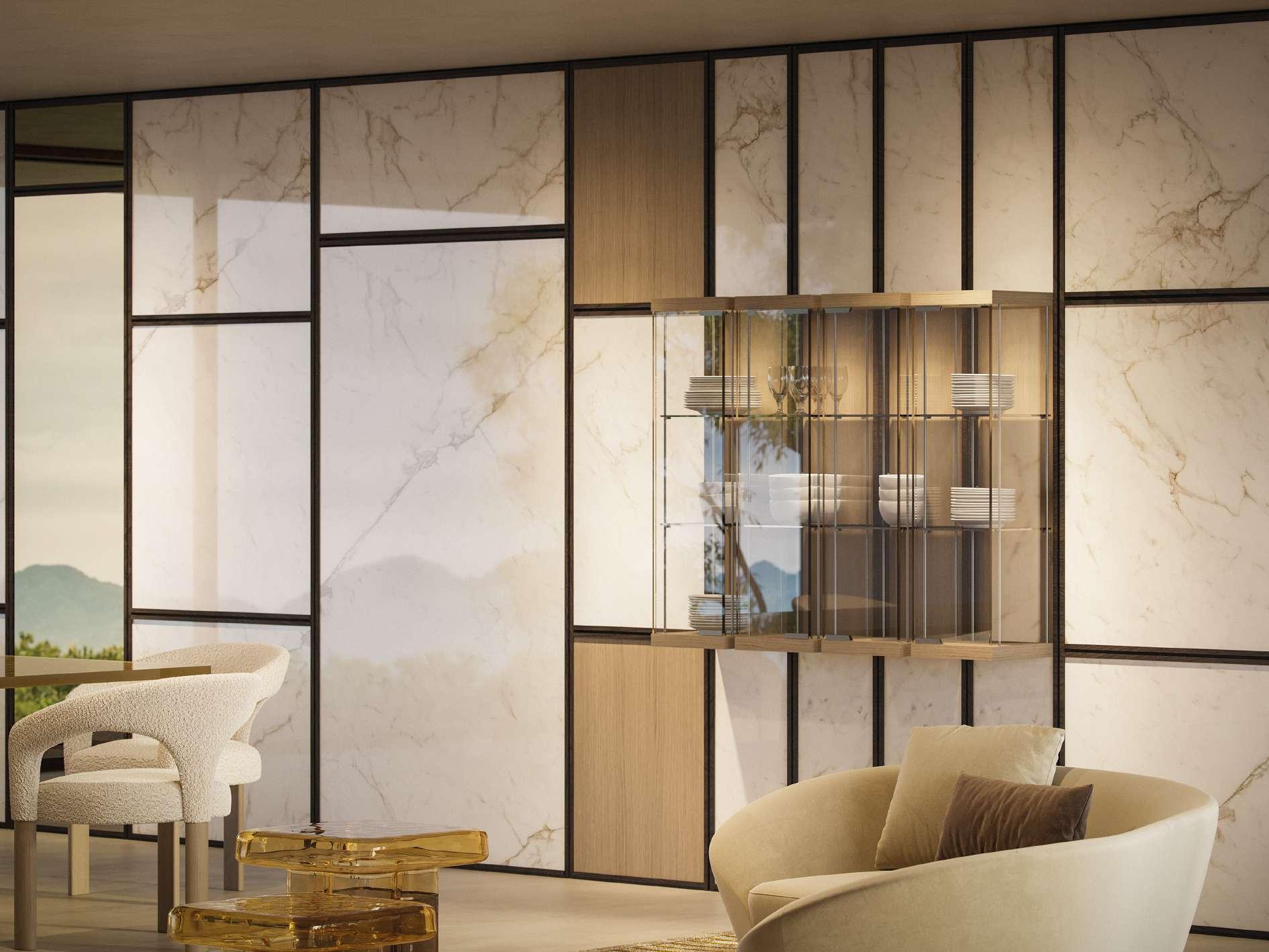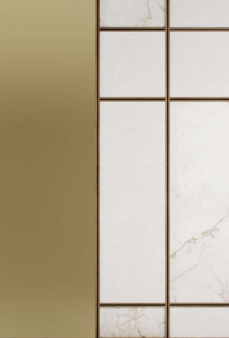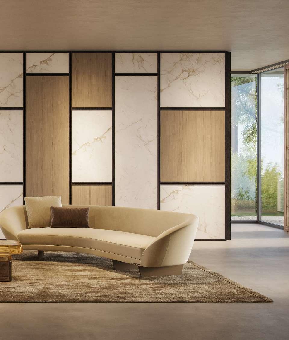 Pannelli in tessuto Mayfair 24 Sand, pannelli in MarmoReflex Calacatta Oro, profili in Frassino Naturale.
