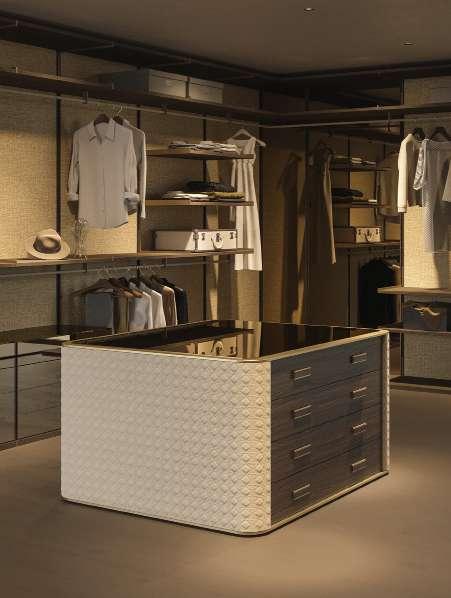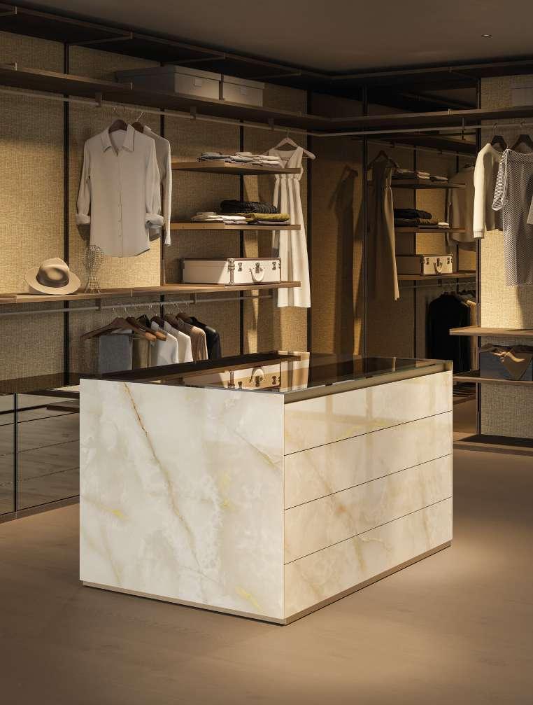 Due moduli isola per cabina armadio con ampi cassetti push-pull e un top in vetro con bordo serigrafato.