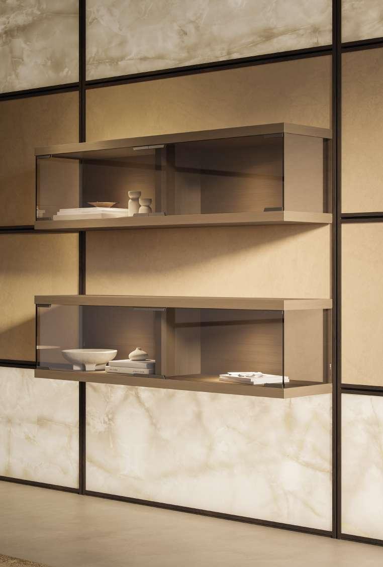 The range of available accessories for Wally includes a diverse selection, such as drawers, fixed and adjustable shelves, display modules, and TV units, making the system highly versatile and suitable for any area of the home.