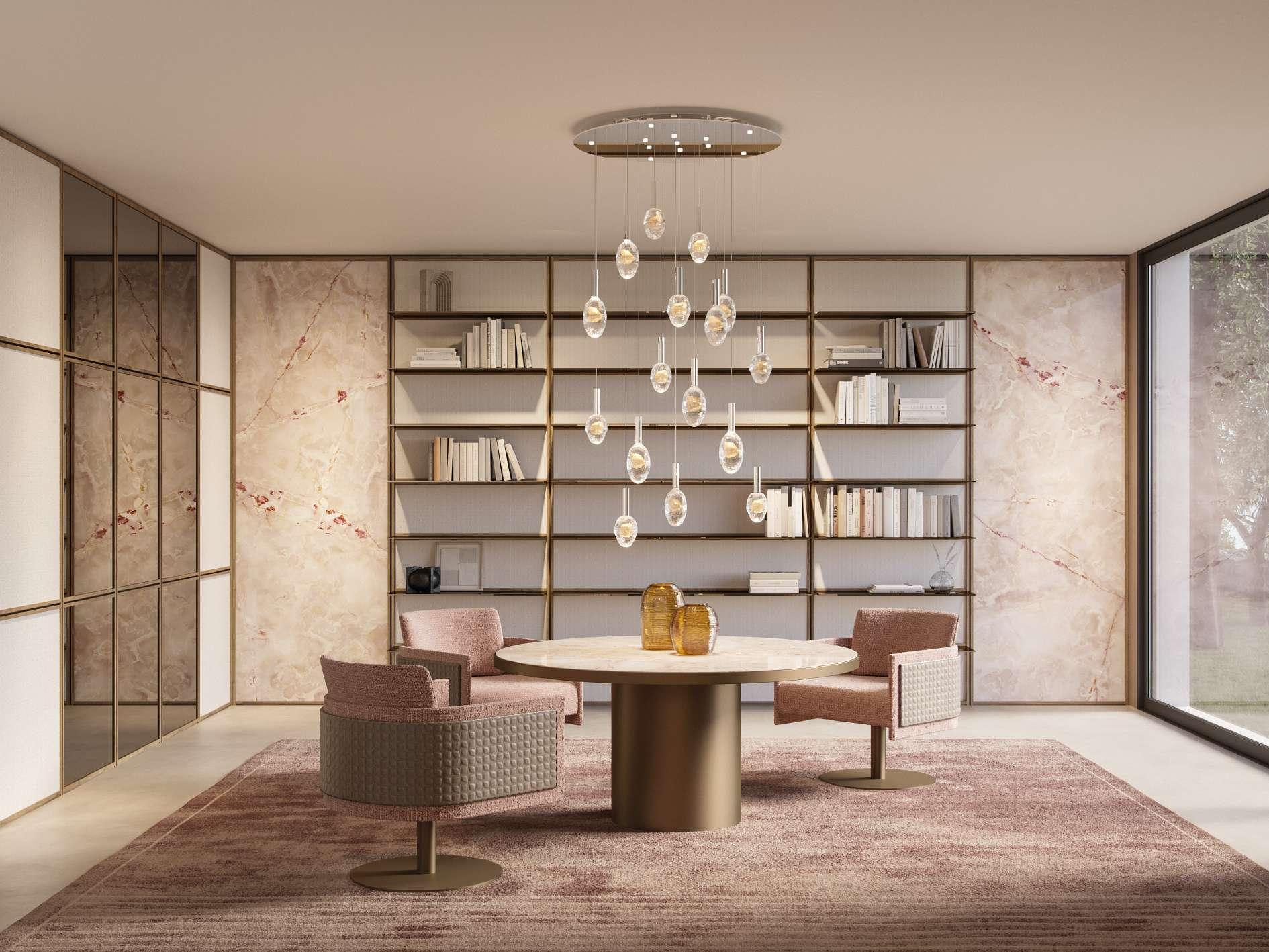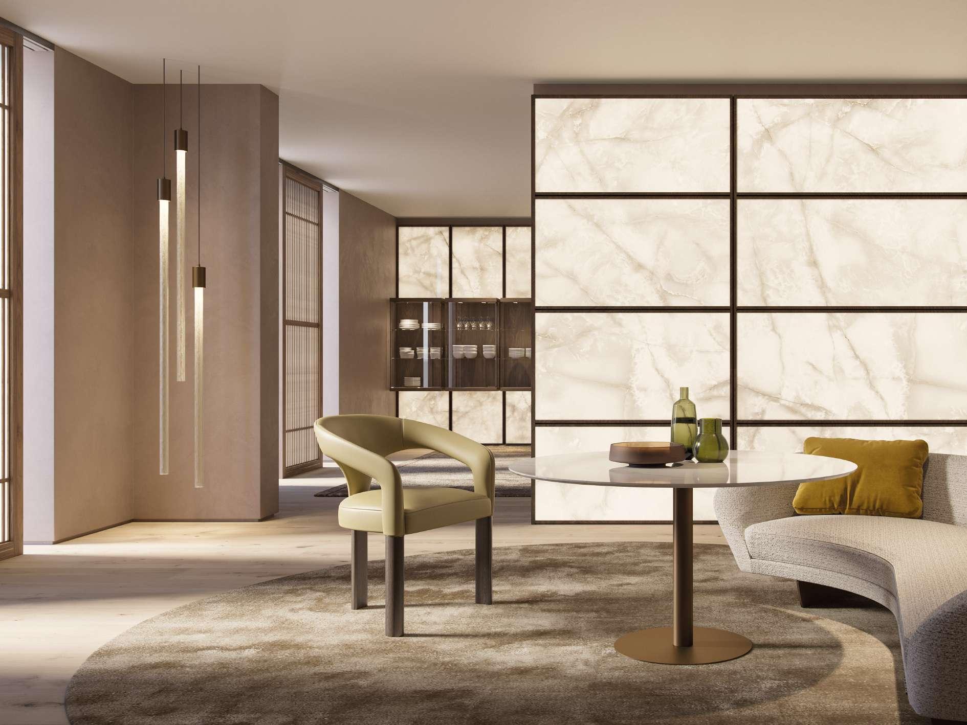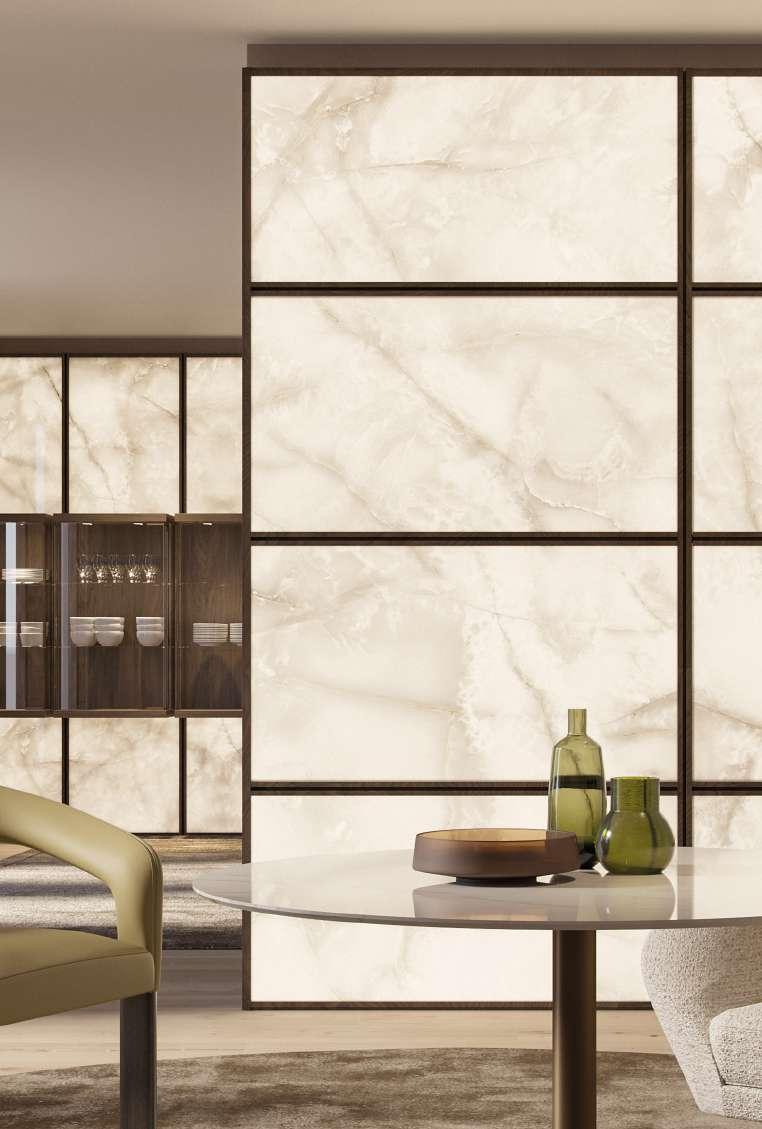 The functional decorative system of Wally allows for experimentation with various geometries and patterns, while the backlighting of MarmoReflex panels adds a touch of sophistication.