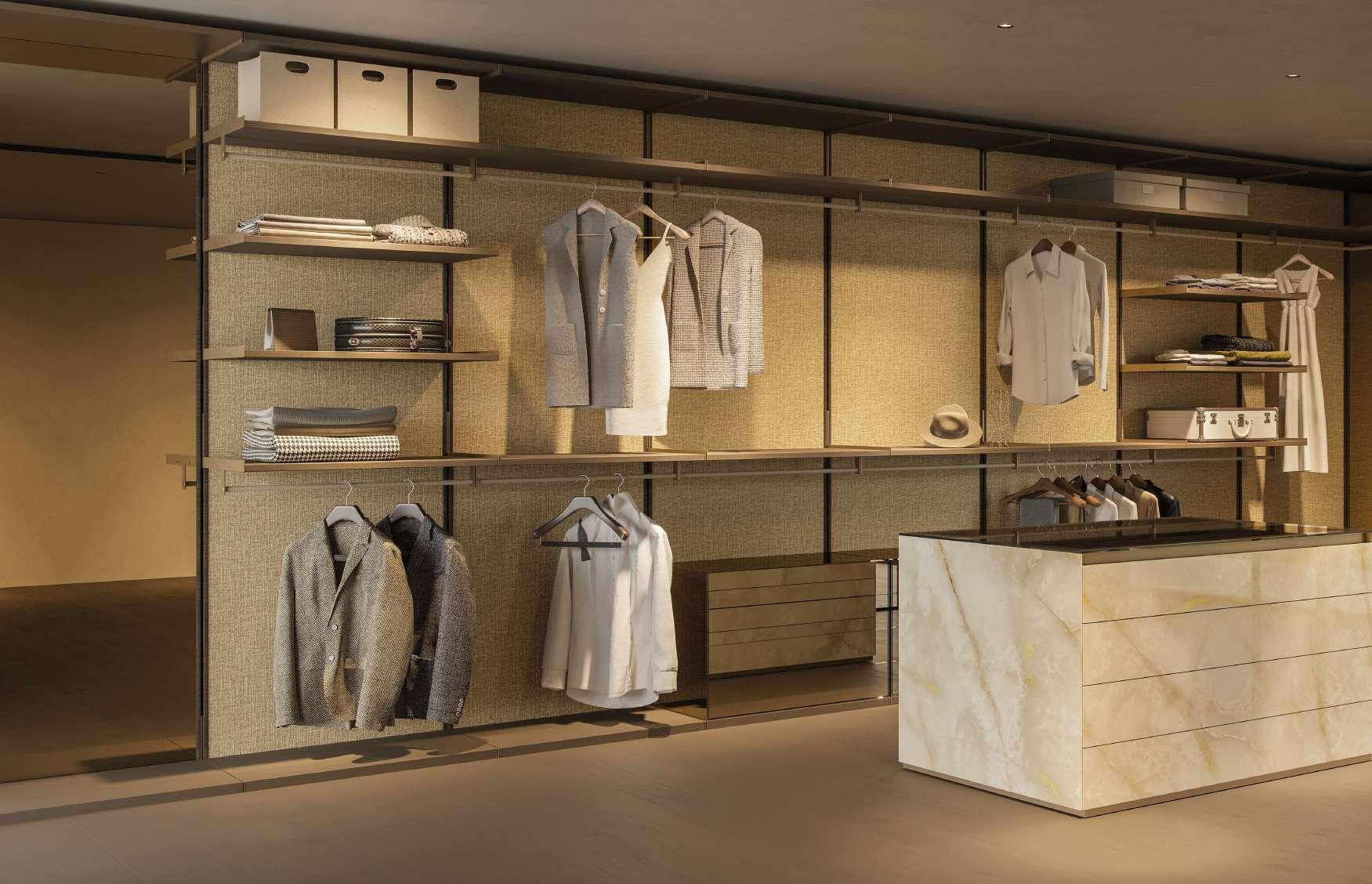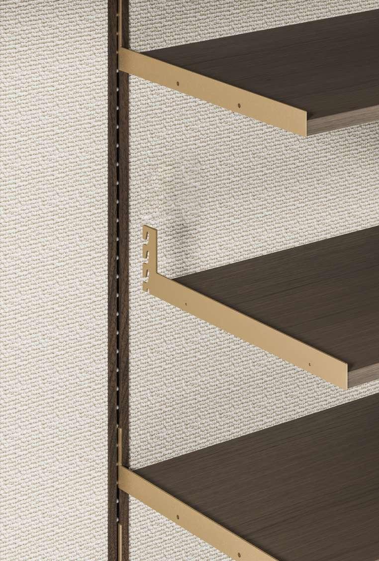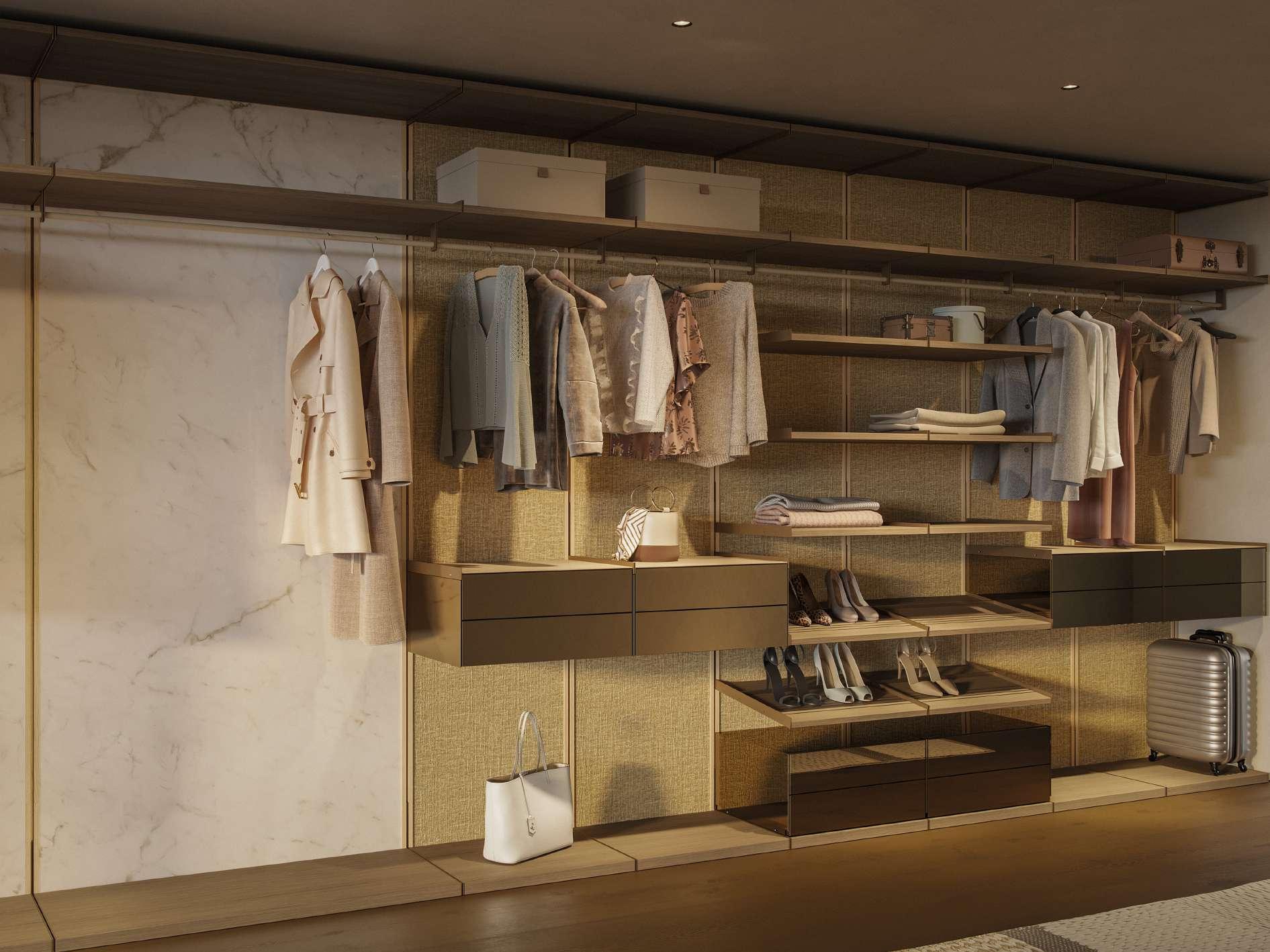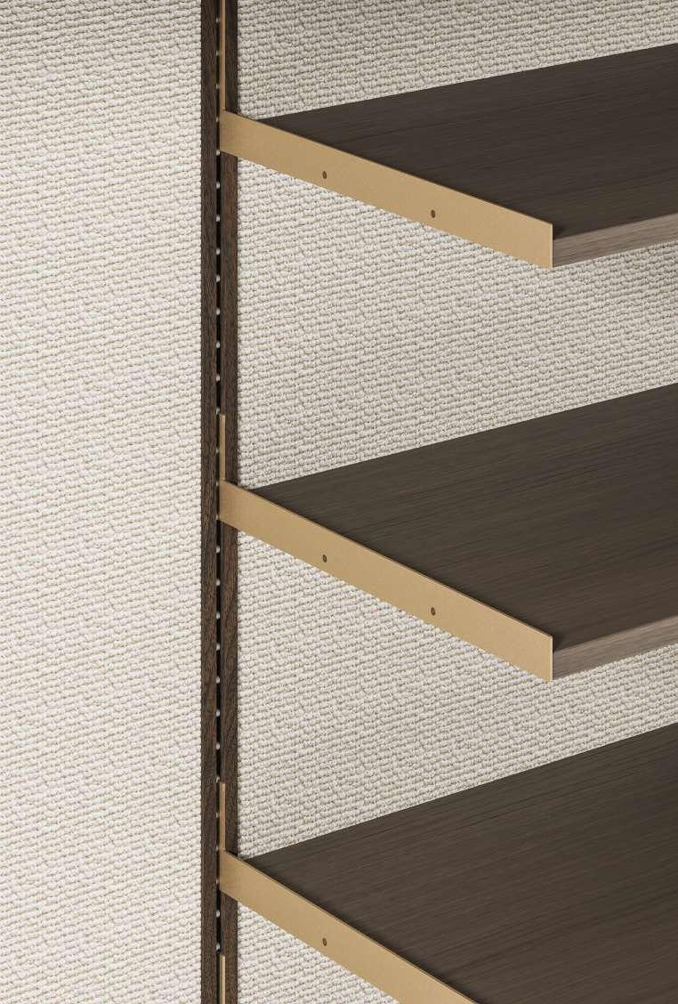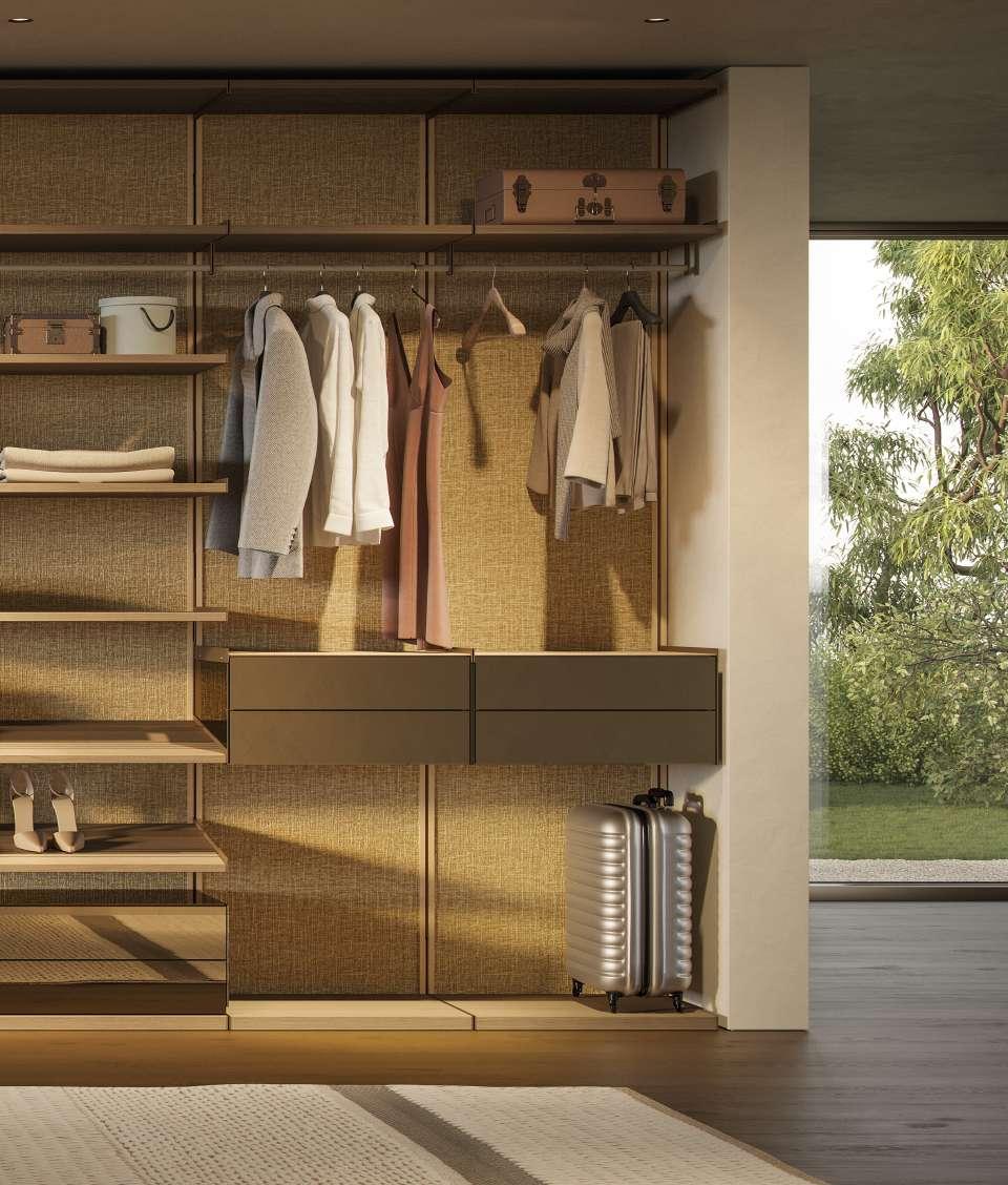 Walk-in closet with drawers and shelves fixed and adjustable. Panels in Mayfair 24 Sand fabric, profiles in Natural Ash. Canaletto Walnut shelves, drawers in Bronze mirror.