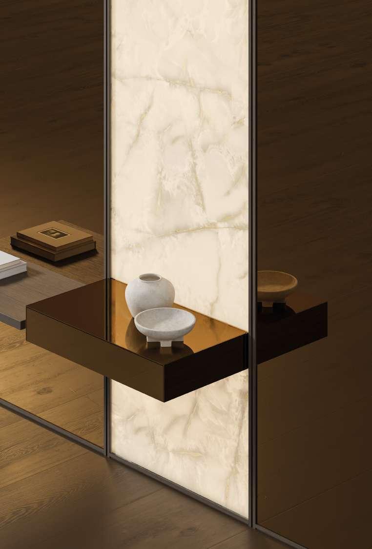 Pannello retroilluminabile in MarmoReflex Onice Oro, pannelli in Specchio Bronzo, profili in Frassino tinta Ebano. Mensola in Noce Canaletto Hennè, cassetto in Specchio Bronzo.
