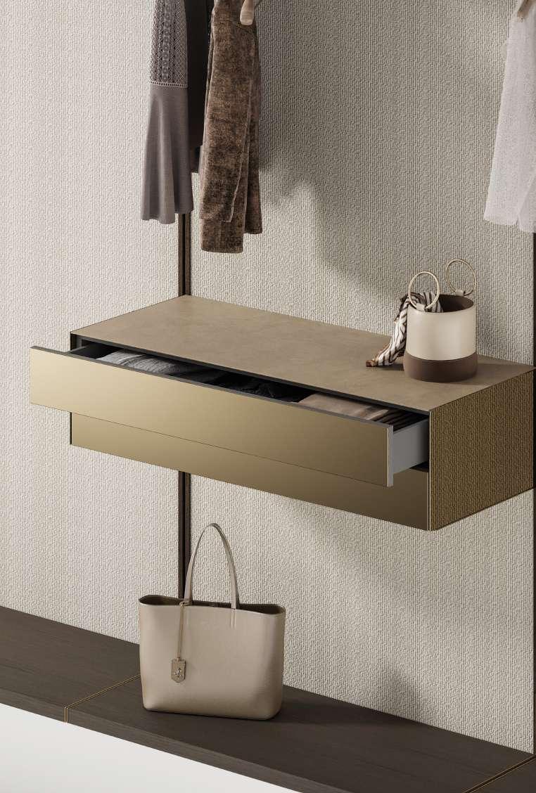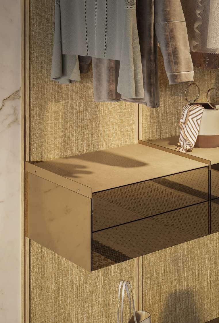 Two modular units for walk-in closet with large push-pull drawers and a glass top with screen-printed edges. Functional and elegant elements that complete the accessories for the Wally walk-in closet.