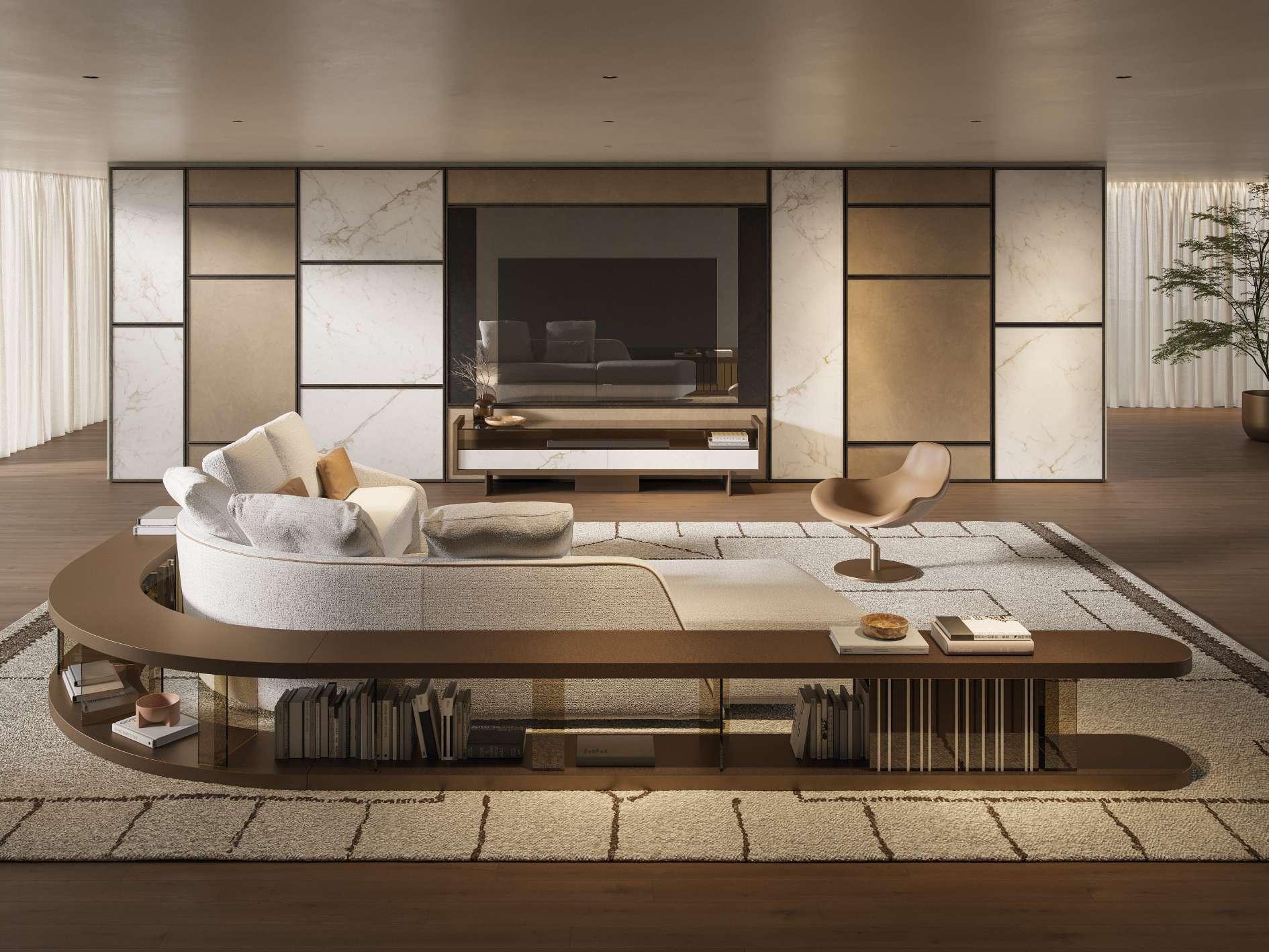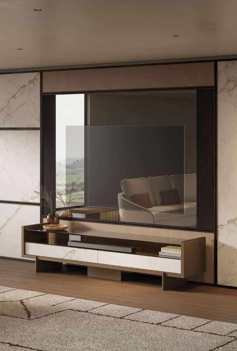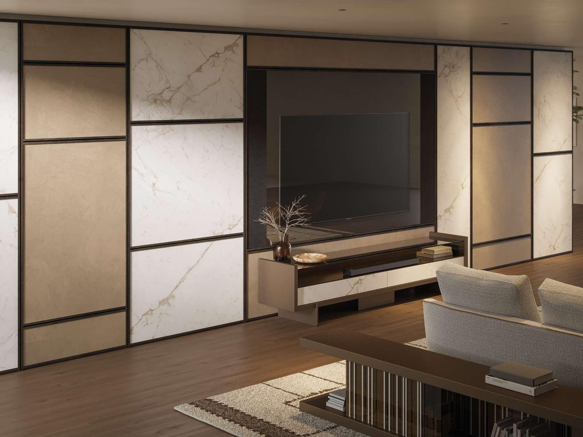 Panelling with TV module for 85-95” TV. panels in MarmoReflex Calacatta Oro, panels in Nabuk Nocciola, profiles in Ebony-stained Ash.