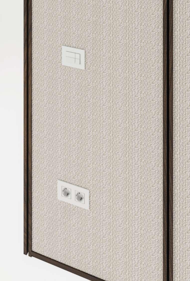 Boiserie soluzione lineare. pannelli in tessuto Roma 07 Cotton, profili in legno in Frassino tinta Ebano. Modulo passaggio.