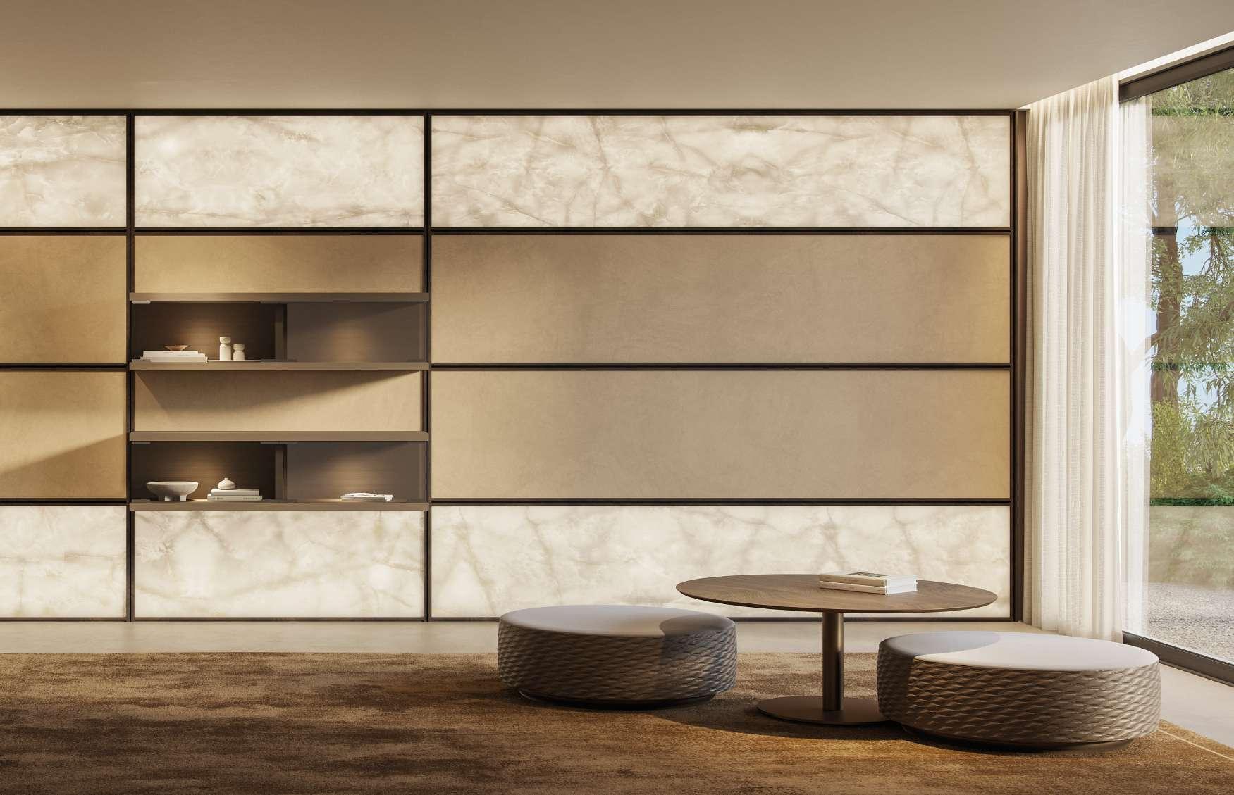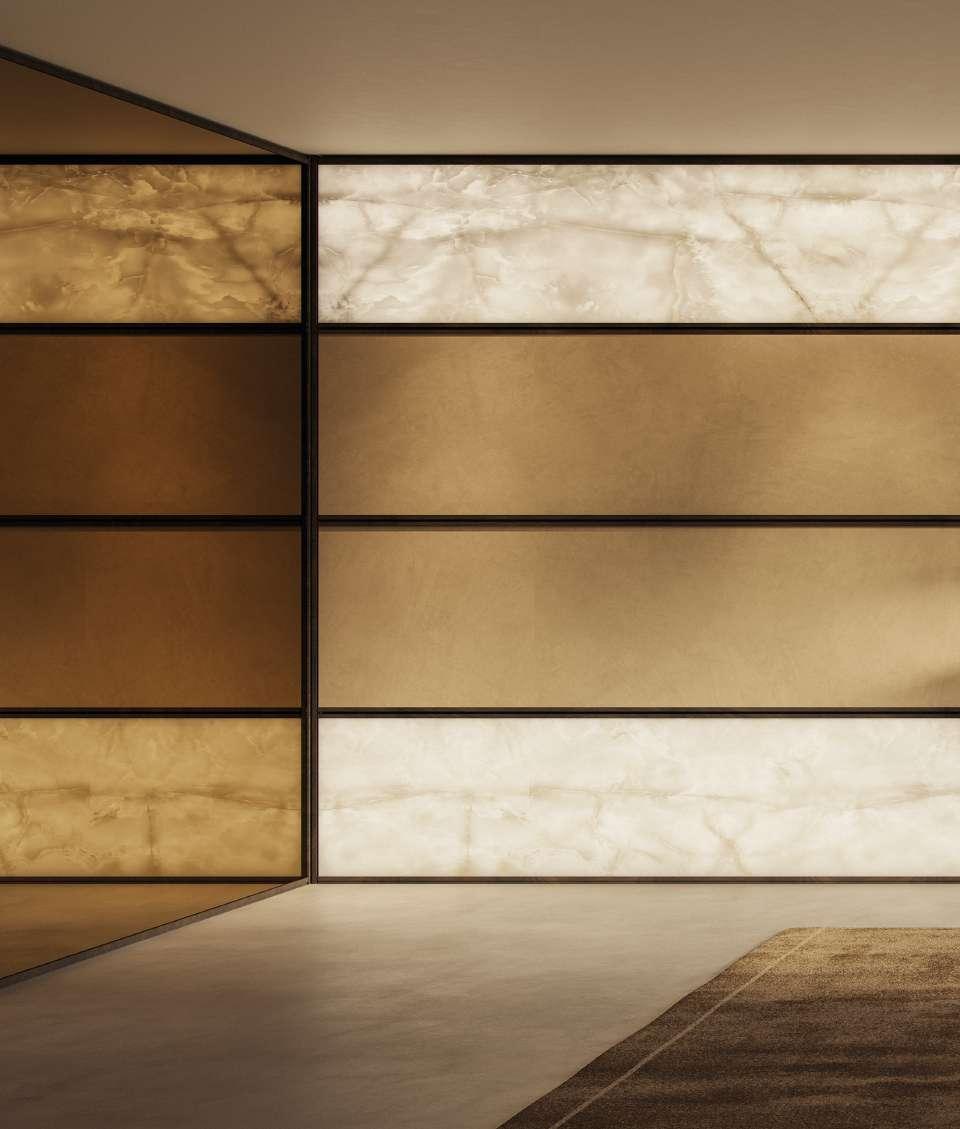 Boiserie with suspended horizontal cabinets. Backlight panel in MarmoReflex Onice Oro, panels in Nabuk Nocciola, profiles in Ebony-stained Ash.