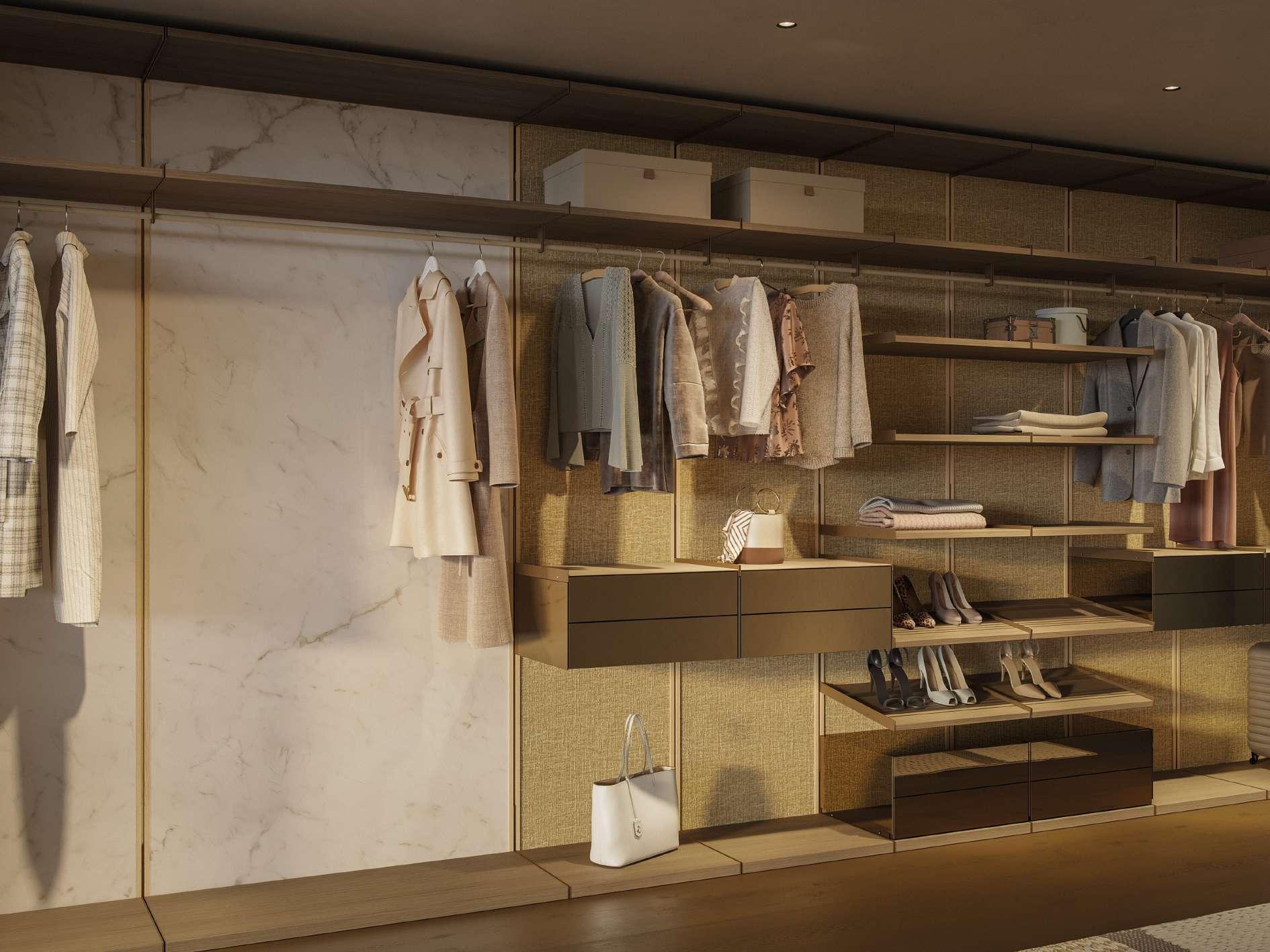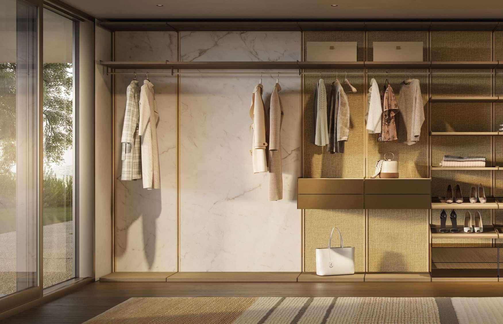 Cabina armadio con cassetti e mensole fisse e regolabili. Pannelli in tessuto Mayfair 24 Sand, pannelli in MarmoReflex Calacatta Oro, profili in Frassino Naturale.