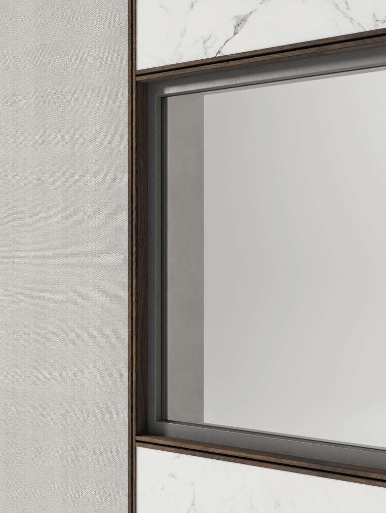 Pannelli in tessuto Parigi 22 Champagne, pannello in Specchio Bronzo, pannello in MarmoReflex Azul Macaubas, profili in Frassino Naturale.