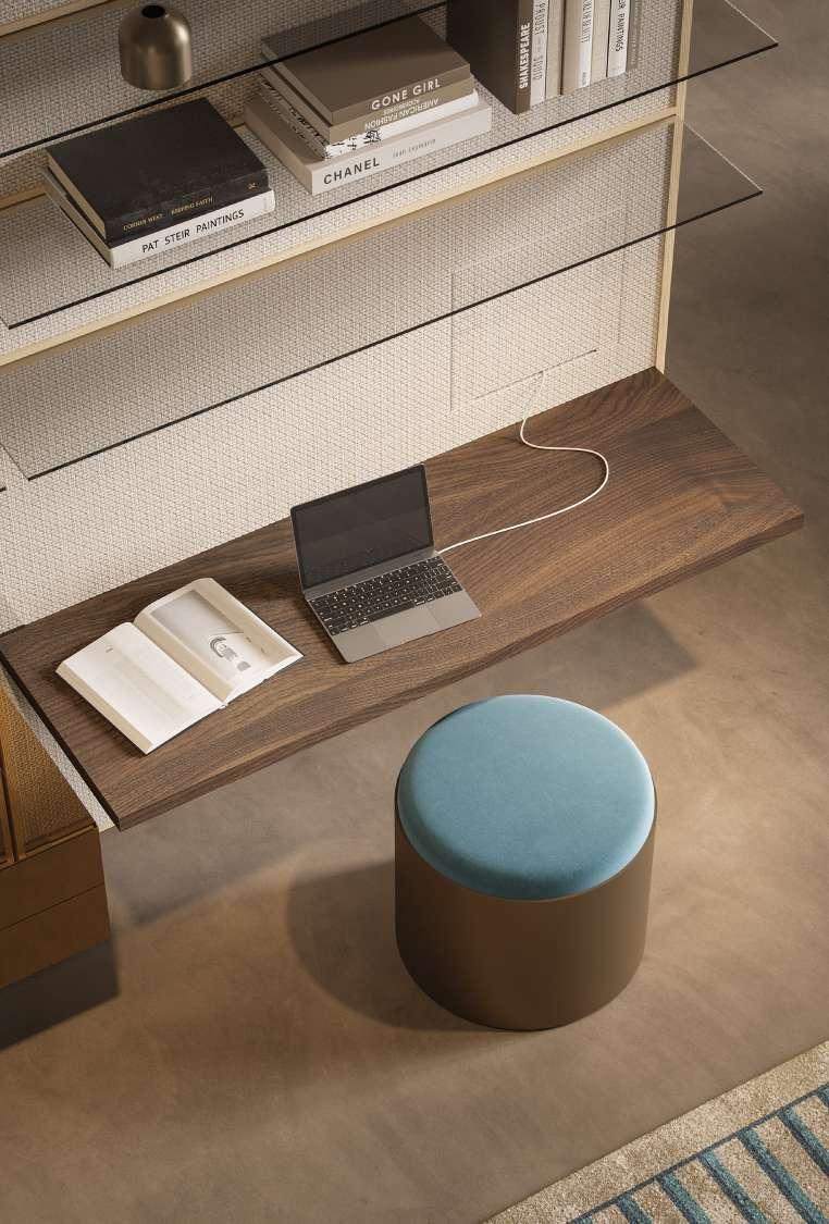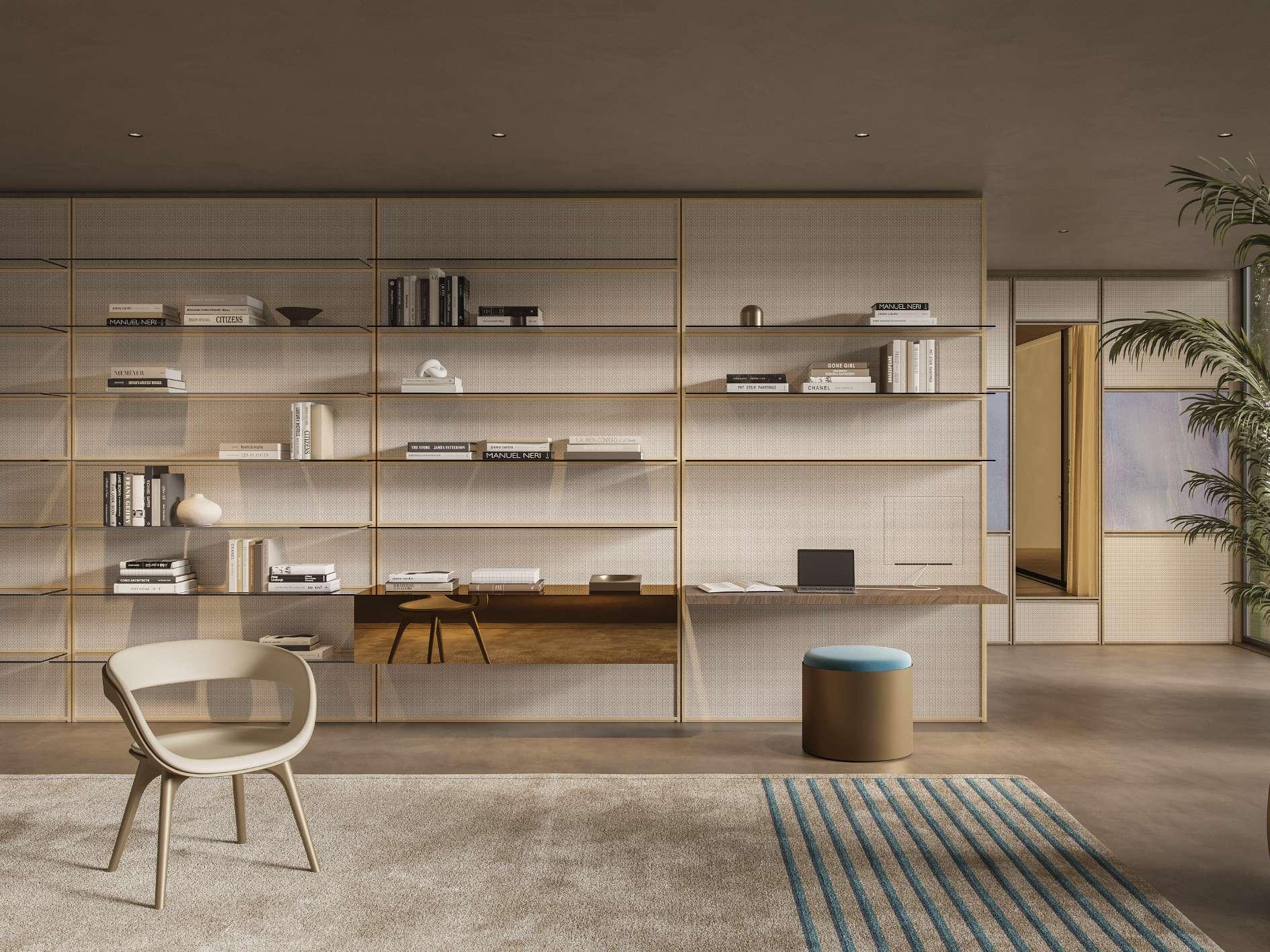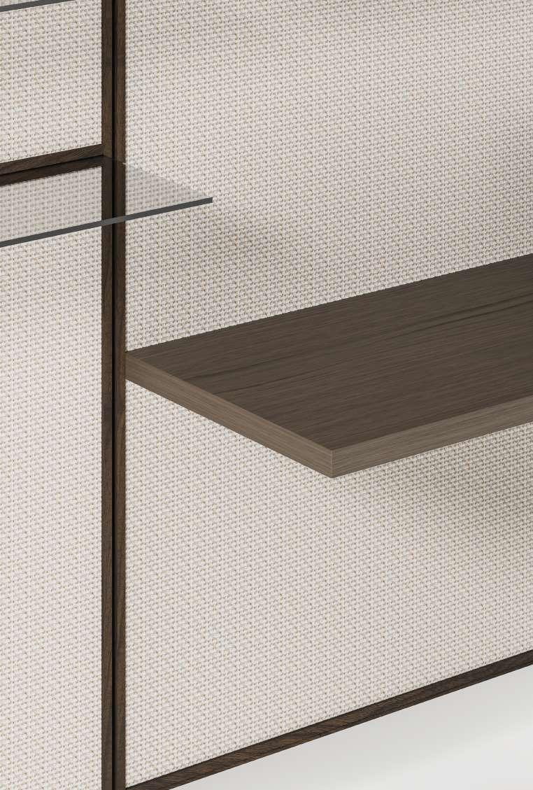 Boiserie with fixed shelves and drawers. panels in Paris 22 Champagne fabric, profiles in Natural Ash. Fixed shelves in Bronze glass, shelf/writing desk in Walnut Canaletto. Fixed drawers in Bronze Mirror.