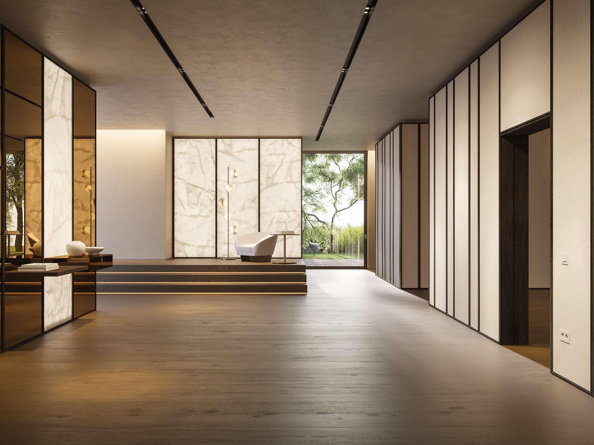 Boiserie linear solution. Backlight panels in MarmoReflex Onice Oro, profiles in Ebony-stained Ash.