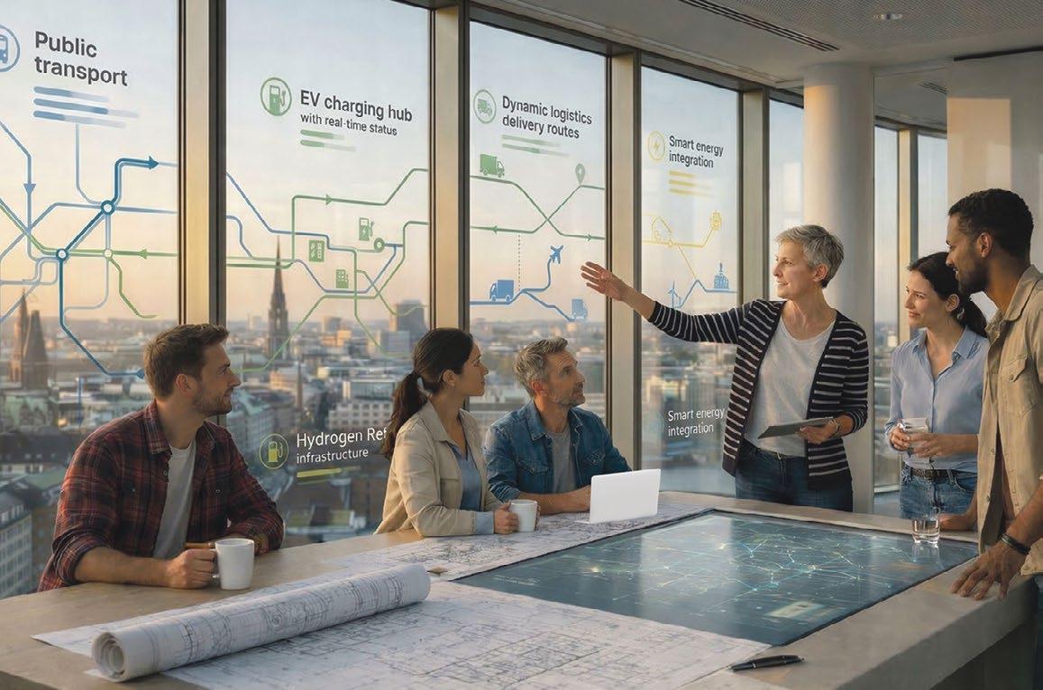 Energie und Mobilität im Umbruch – das klingt zunächst nach großer Politik. Tatsächlich vollzieht sich der Wandel aber nicht allein in politischen Debat ten, sondern immer öfter vor der eigenen Haustür: an der Ladesäule daheim oder auf dem Firmenparkplatz, in der intelligent vernetzten Fabrikhalle, im KI-gestützten Verkehrsmanagement der Region. Genau dort, im Alltag, wachsen Energie- und Mobilitätsfragen zusammen. Für Unternehmen gilt: Wer diese Verknüpfung früh