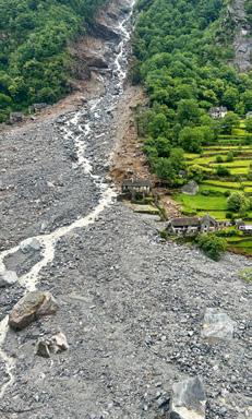 Luftaufnahmen machen das Ausmass der Katastrophe sichtbar Gegen 3 Uhr morgens nehmen die starken Niederschläge etwas ab, und die Crew kann abheben. Mit an Bord ist wiederum ein Rettungsspezialist Helikopter. In Cevio fordert die Crew bei der Rega-Einsatzzentrale einen zweiten Rettungshelikopter an und beginnt sofort, Personen mit der Rettungswinde zu evakuieren. Kurz darauf trifft die Rega-Crew der Basis Samedan zur Unterstützung ein. Es folgen viele Notrufe aus verschiedenen Dörfern im Val Lavizzara und im Val Bavona. Dank der Fotos und Videos, die die beiden RegaCrews, die als Erste vor Ort waren, aufnehmen konnten, gewinnt man einen Überblick über die Situation. Der regionale Krisenstab unter Führung der Kantonspolizei Tessin wird akti-