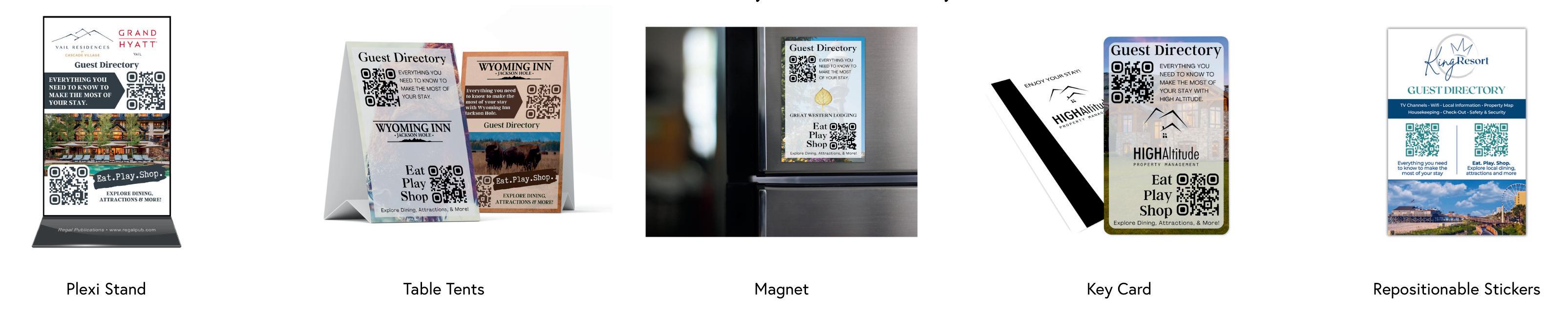 Regal custom digital directory is accessible by QR code and is presented on tabletop displays (see below) in every room. Scan of the QR codes below to see the user experience.