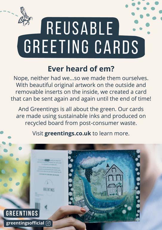 WealsospeaktoKerryLinacre aboutGreentings,anewbusiness makingsustainablegreetingscards. Eachcardismeanttobeusedthree timesandenvironmentally-conscious Kerryplantsatreeforeverycardsold.