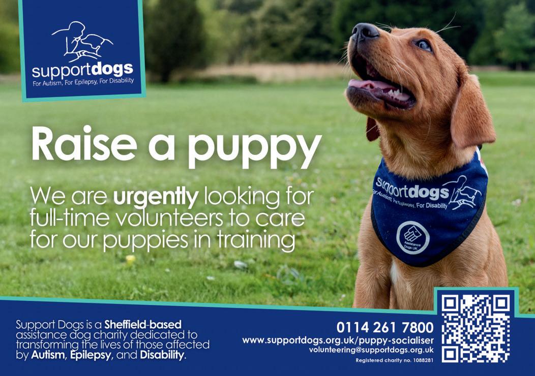 Support Dogs desperately needs more puppy socialisers. If you have time to dedicate to looking after a puppy, live within reasonable distance of their centre and have an enclosed garden, please call 0114 261 7800 or visit www.supportdogs.org.uk