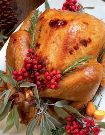 1. In a large bowl, dissolve the salt and sugar in the water, then add the aromatics. Submerge the tur-key pieces completely, cover, and refrigerate for two hours. Once brined, drain, rinse lightly, and pat dry thoroughly.