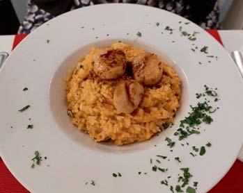 Formaincourseweoptedforthe scallopdish(£20)fromthespecials’ menu.Thescallopswereperfectly cookedandmeltedinyourmouthand thecreamytomato,mascarponeand prawnrisottowascookedwellwith