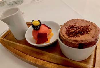 Tofinish,ablackberrysoufflécame pipinghotandwasservedwithasweet cheesecakecustardandsharpblood orangesorbet,agreatcontrastoftastes. Acrossthetable,mywifeenjoyed apricot,goatsmilk,physalisandwhite chocolate,atriumphoftextureand flavours.