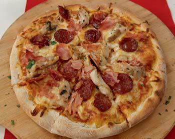 severallargeprawnsinside.Ourother mainwasPizzaCarne(£13);tomato, mozzarellacheese,pepperoni,chicken andham.Thepizzabasewasjustthe rightthickness,andthemeattoppings wereverygenerous.