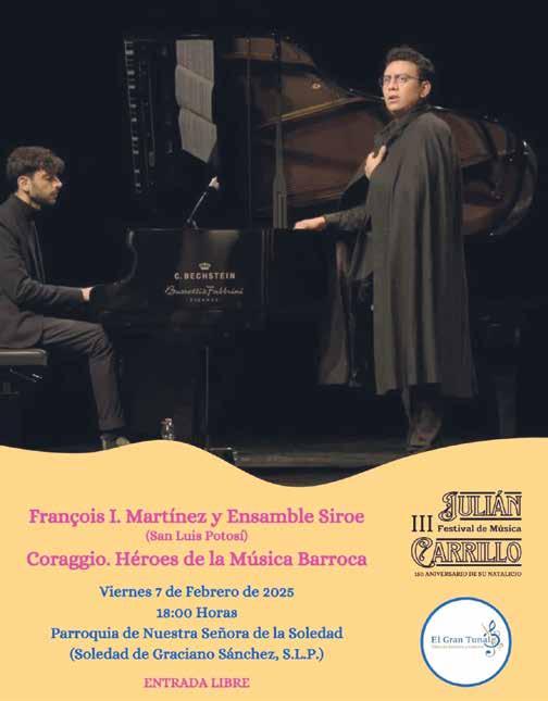 labor que ha venido realizando la Asociación Civil El Gran Tunal que, de manera altruista y con el único fin de promover el arte y la cultura, ha asumido el enorme reto de realizar este tipo de eventos con la intención de que el público potosino tenga la oportunidad de presenciar espectáculos artísticos de alta calidad y, a la par, se preserve la historia y el legado de Julián Carrillo, músico originario del vecino municipio de Ahualulco. En ese sentido, reiteró la invitación para que la comunidad en general se dé la oportunidad de acudir a este concierto que se estará llevando a cabo el próximo viernes 7 de febrero en punto de las 18:00 horas en la Parroquia de Nuestra Señora de la Soledad con entrada gratuita.