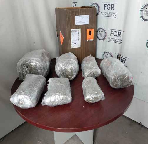 sencia de material orgánico en su interior; al abrir la caja se localizaron siete envoltorios de plástico de distintas dimensiones, los cuales contenían hierba verde y seca con las características propias de la marihuana, con peso aproximado de 8.1 kilos.