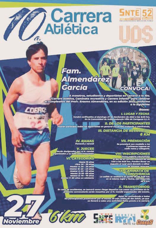 P.D. 5- Gracias al director del pe riódico, El Sol de San Luis, Ricardo Ortega, por hacernos parte de su gran fiesta de 70 aniversario. El Sol de San Luis me ha permitido cono cer grandes maestros y construir grandes amigos. Apúntense y co rran tres o 10 kilómetros. Se trata de convivir y celebrar.