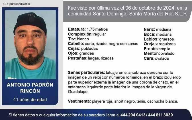 Cualquier información que se tenga para la pronta localización de Antonio Padrón Rincón, pueden comunicarla al teléfono: 4442-04-04-13 y 4448-11-30-39.