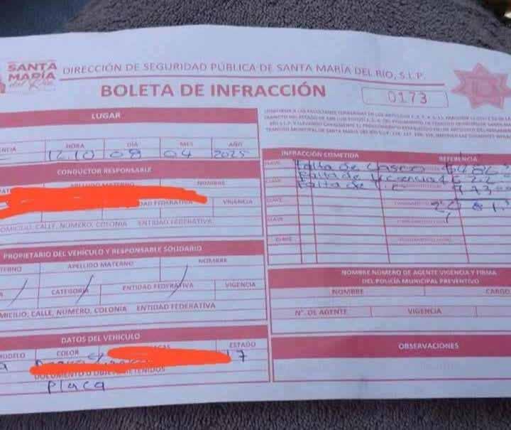 SANTA MARÍA DEL RÍO. - La controversia en torno a los operativos viales implementados por la Policía Municipal ha vuelto a encender el malestar entre ciudadanos de este municipio, luego de que este martes se reportara nuevamente la instalación de retenes en diversos puntos de la cabecera, donde se habrían impuesto multas que superan los 2,000 pesos, según muestran varios recibos oficiales que comenzaron a circular en redes sociales.