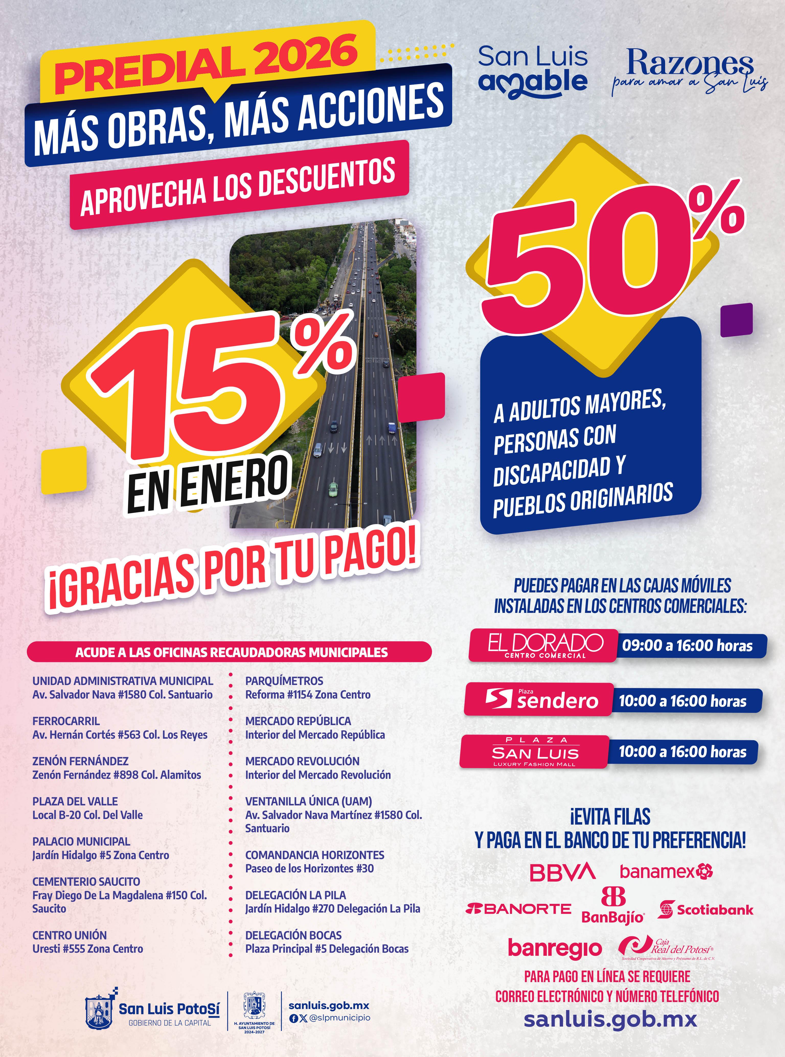 Este punto de cobro permanecerá en funcionamiento hasta el próximo viernes 16 de enero, en un horario de 7:00 a 16:00 horas, permitiendo a las y los contribuyentes aprovechar los descuentos vigentes que impulsa la Dirección de Catastro Municipal: 15 por ciento durante el mes de enero, 10 por ciento en febrero y 5 por ciento en marzo.