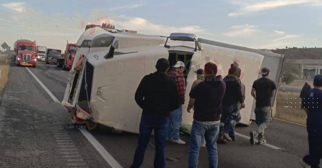 SANTA MARÍA DEL RÍO. - La mañana de este lunes se registró un aparatoso accidente sobre la carretera federal 57, a la altura del kilómetro 157, donde un tráiler quedó atravesado sobre la cinta asfáltica, provocando el cierre total del carril con dirección de México hacia la capital potosina.