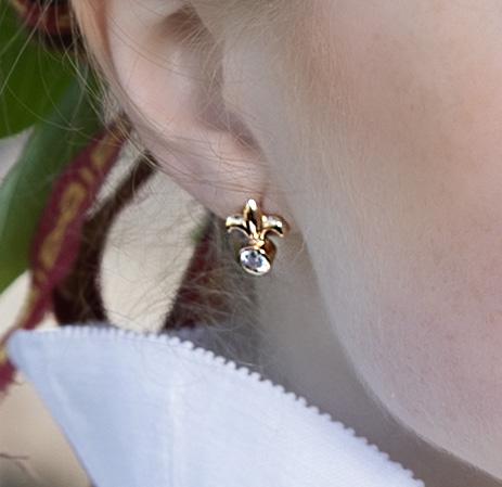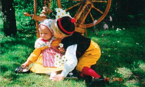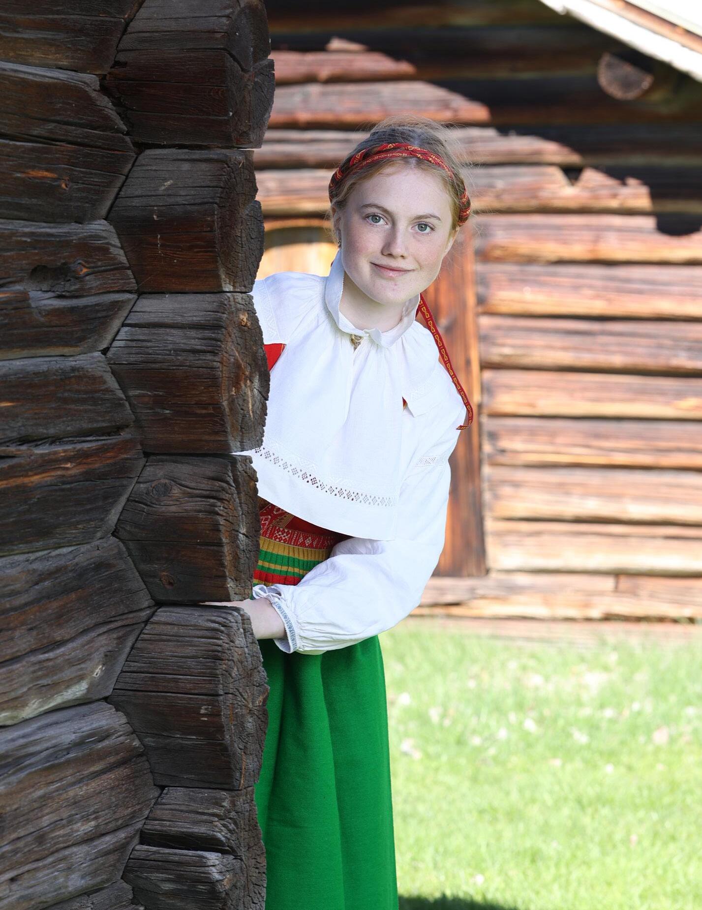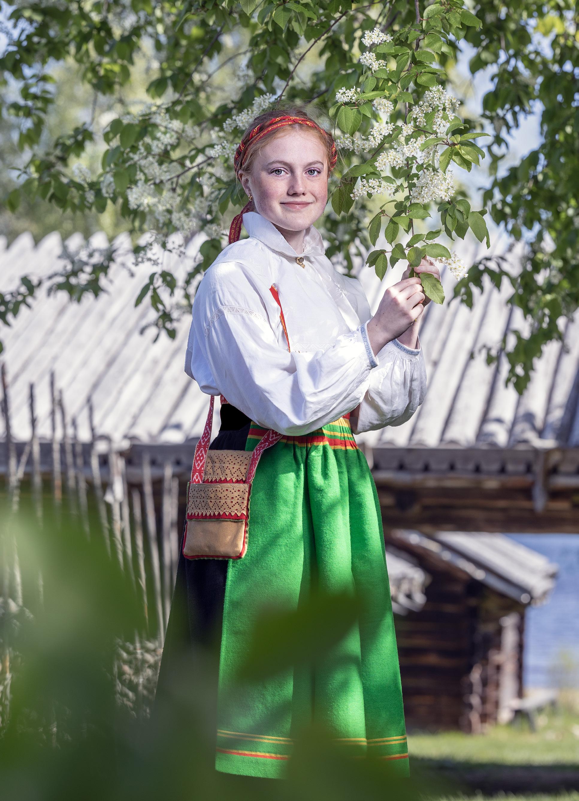 Moa Jareholm i Moradräkt på Zorns Gammelgård. Den gröna magden kan bäras mellan majseptember. Mora Hemslöjd har bundit håret med Moraband enligt traditionell teknik.